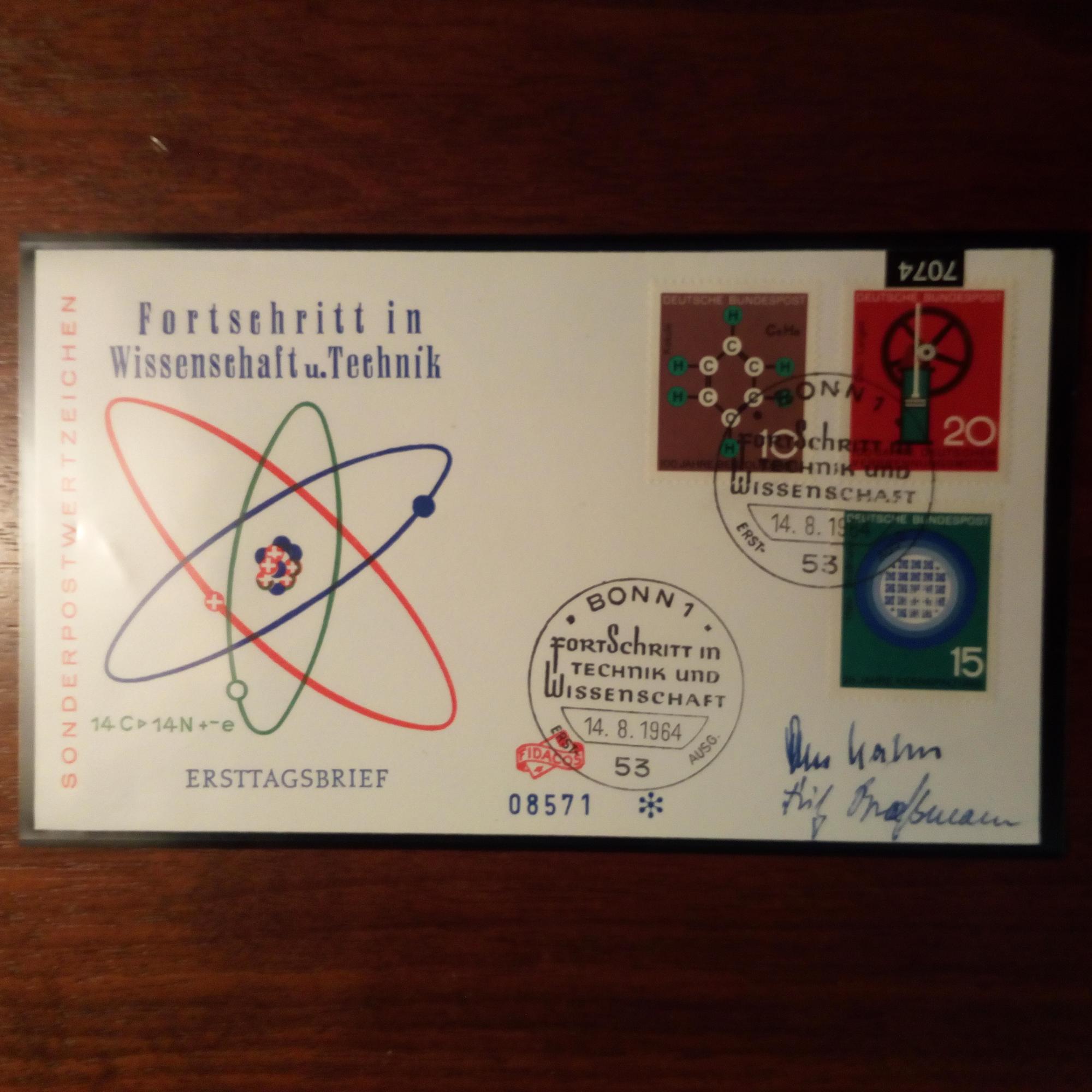FDC ("Fortschritt in Technik und Wissenschaft" 14.8.1964, mit Abb. eines Atomkerns) mit den U. der beiden Entdecker der Atomkernspaltung Otto Hahn (1879-1968) und Fritz Strassmann (1902-80).