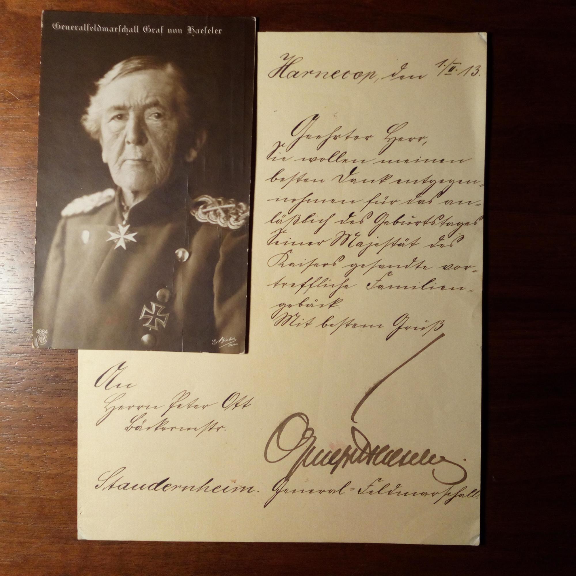 1836-1919, preuss. Graf, Generalfeldmarschall - 1. Brief mit U., Harnekop (Brandenburg) 1.2.1913, 1 S. kl. 4°. Dankt einem Bäckermeister "für das anläßlich des Geburtstages Seiner Majestät des Kaisers gesandte vortreffliche Familiengebäck...". 2. E. postal. Ansichtskarte (Pfo.) in Stenographie, 8.10.1915. An Fräulein Julie Fialla in Wien. 3. E. Schreiben mit U., 26.3.1916, ¾ S. kl .8°, mit e. postal. Umschlag (4 Lacksiegel und Stempel, Feldpost). "An den Verlag der Metzger Zeitung...Zeichnung eines Beitrages..."Feldgrauer in Eisen"...Zehn Mark...