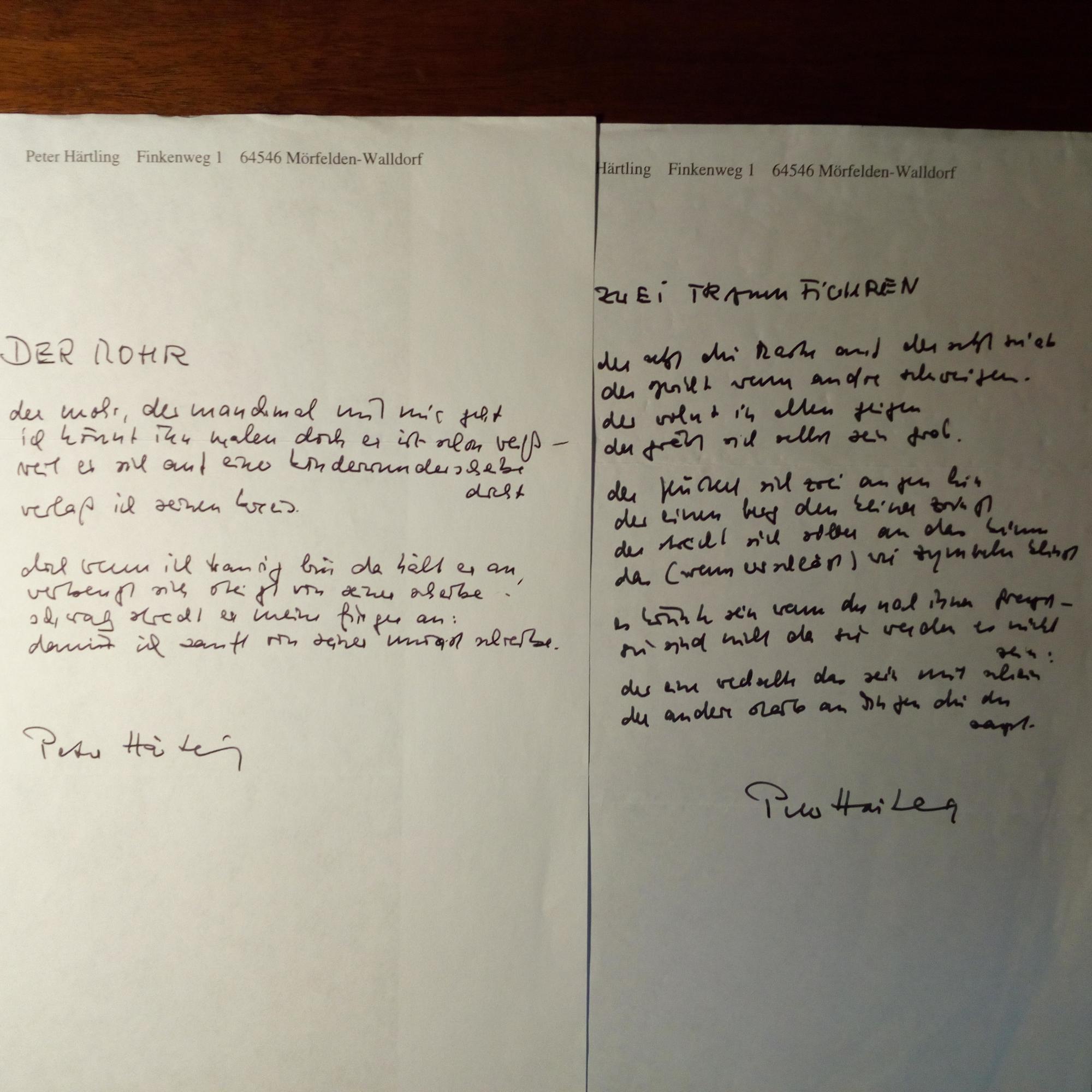 1933-2017, Schriftsteller und Publizist - Je 4°-Blatt mit e. Gedicht und U.: "Zwischen den Altern" (mit Widm., 12.12.1984, mit postal. Umschlag), "Der Rohr" und weiteres (die beiden letzten mit Br.kopf). Beiliegt Papierstreifen mit U., und U. auf Titel seines Luchterhand-TB "Niembsch oder Der Stillstand", Darmstadt 1987.
