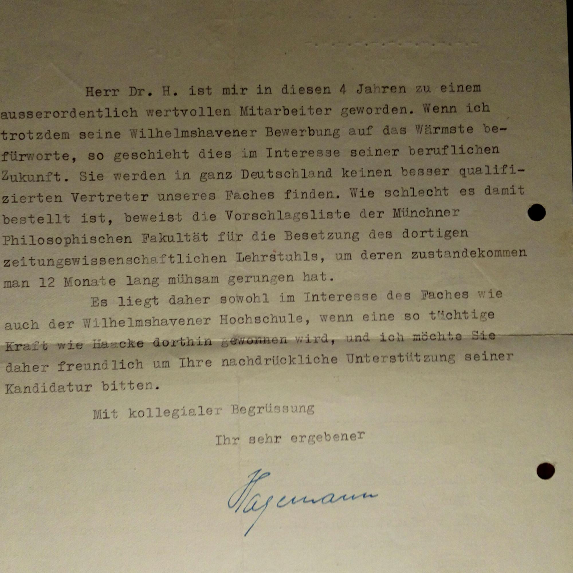 1900-64, Publizistik-Wissenschaftler und Politiker (Ost-CDU) - Brief mit U., (Münster) 16.4.1953, 1 ½ S. 4°, dicht geschr., Bearb.notizen, gel. An den Kollegen Lenz in Bielefeld: Ausführl. Empfehlung für seinen Assistenten Wilmont Haacke (1911-2008) "als geeigneten Dozenten für unser Fach in Wilhelmshaven...".
