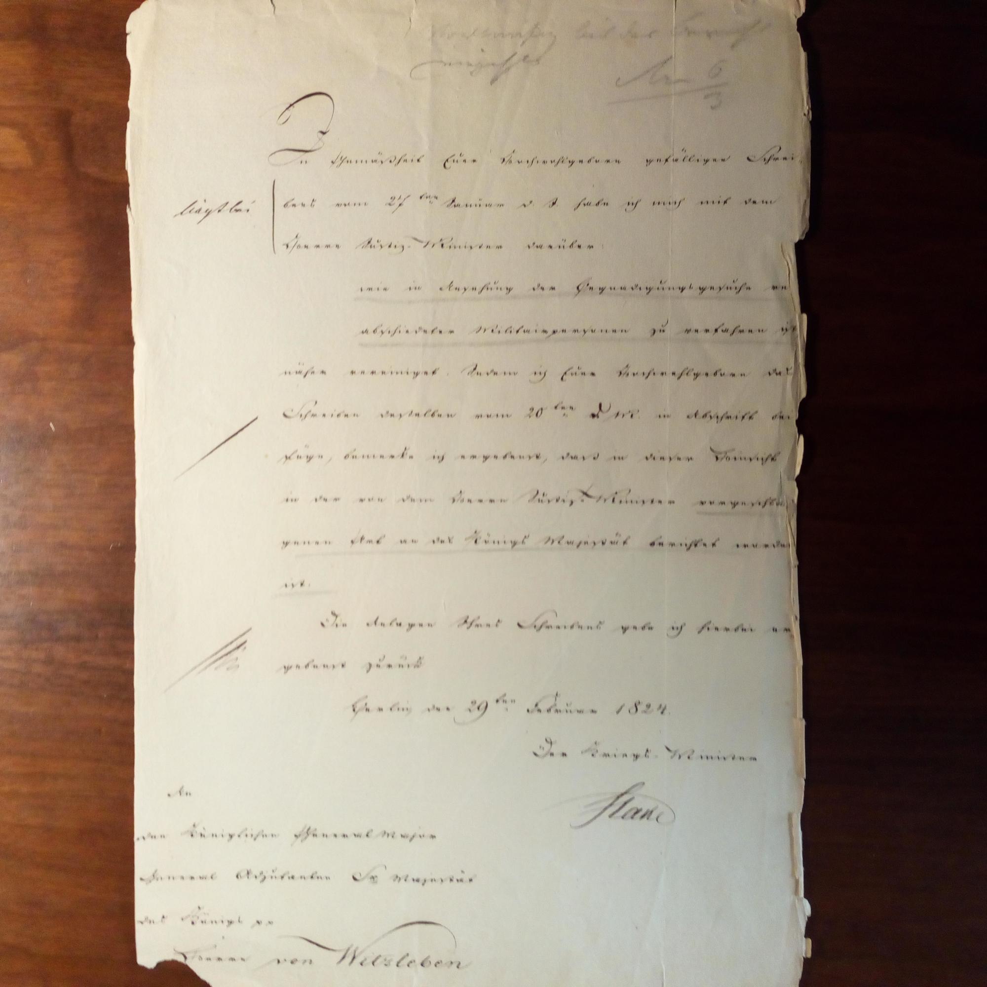 1768-1835, preuß. Generalleutnant, Kriegsminister - Brief mit U., Berlin 29.2.1824, 1 S. folio, Bearb.vermerk, Randschäden ohne Verl. An den General-Adjudanten von König Friedrich Wilhelm III. und seinen späteren Nachfolger Job von Witzleben (1783-1837): Betr. eines Schreibens, das dieser ihm zum Thema "Begnadigungsgesuche von verabschiedeten Militairspersonen" übersandt hatte: Nach Rücksprache mit dem Justizminister wurde der König informiert.