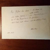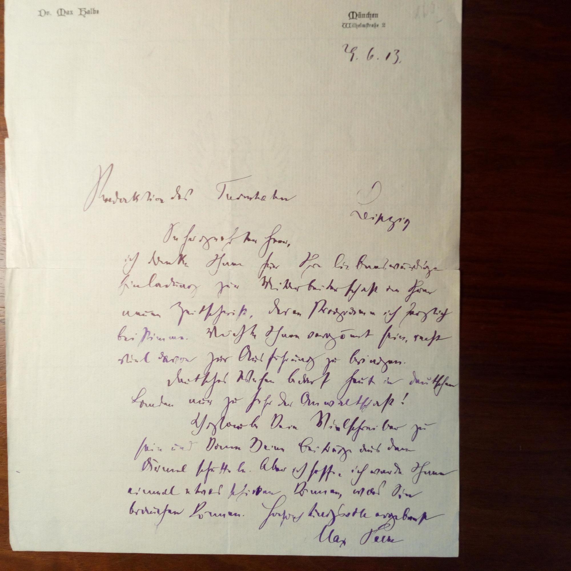 1865-1944, Schriftsteller - Konvolut von zus. 11 Autographen, teilw. mit kl. Gebr.spuren: 1. 2 Visitenkarten, je mit e. Zeilen: Dankt für Einladung bzw. Glückwünsche (diese mit D. Berlin 22.9.1897). 2. E. postal. Postkarte mit U., München 13.8.1900. An den Berliner Verleger Georg Bondi (1865-1935), z. Zt. Ramsau (bei Berchtesgaden). Dankt für "'Jugend' 9 Aufl.". ...soeben von einer Radtour nach Pontresina, wo ich mit Hegeler zusammen war...heimgekehrt... 3. E. Brief mit U., z. Zt. Finsterwald, Gmund 22.7.1904, 2 S. 4°, Briefkopf. Ist bereit "eine Novelle für den Weinfreund" zu schreiben. Bittet erst um Antwort auf versch. praktische Fragen, "sonst nimmt eine glücklich begonnene Verbindung ein unrühmliches Ende...". 4. E. Brief mit U., (München) 29.6.1913, 1 S. 4°. An die Redaktion des "Turmhahn" in Leipzig: Dankt für "Einladung zur Mitarbeiterschaft". 5. E. Brief mit U. An einen Verlag: Sendet ein "Blatt" anlässl. des 60sten Geb. der Dichterin Anna Croissant-Rust (1860-1943). 6. E. postal. Ansichtskarte (Pfo.) mit U., an RA Frankl in Wien: Dankt für Brief. 7. Kurzbrief mit U., München 5.2.1926, 8° quer, Br.kopf. Dankt dem "Künstler-Sänger-Verein" in München für "freundliche Einladung nach Damaskus". 8. Brief mit e. Zusatz und U., 1 S. 4°, Br.kopf. Dankt Anders für "glückhaftes Gelingen" seines Werkes, bes. dem Bühnenbildner. Beiliegen: Albumeintrag mit U., O. und D. (1918), U. auf "Autographenkarte" für die Weltausstellung in Karlsruhe 1905 und Neujahrskärtchen mit U. und D. (1936), mit e. postal. Umschlag.