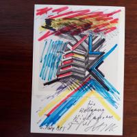 1927-2005, Bildhauer und Graphiker - Karte mit e. abstrakter Zeichnung (farbig, Mischtechnik), mit Widm., U. und D. 6.3. 1985. Beiliegt Biografie-Doppelblatt (4°) mit U. unter Pfo. auf Vorderseite, kl. Druck einer Graphik mit U., und Karte mit U. und D. 1988.