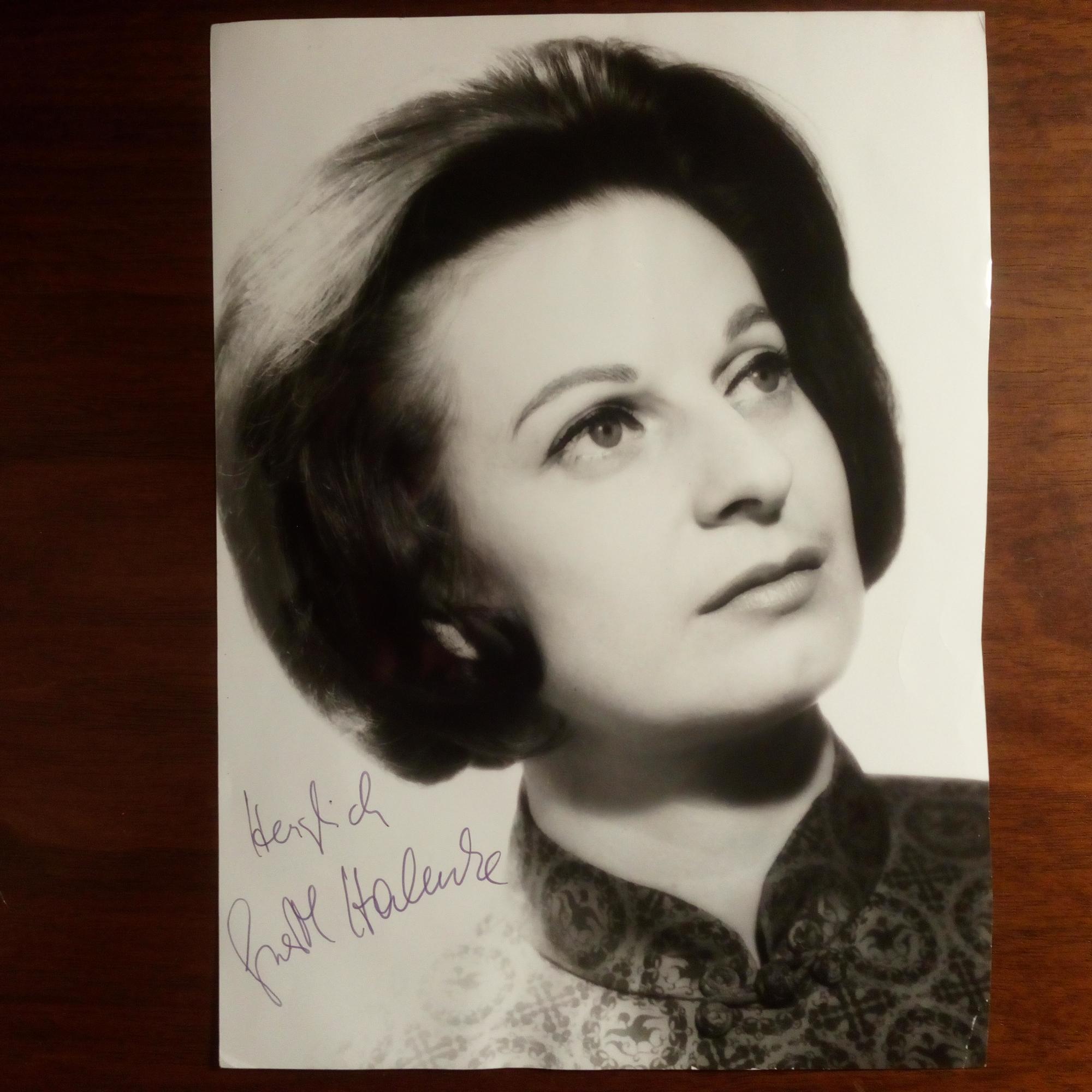 1930-2022, Schauspielerin und Hörspiel-Sprecherin - Pfo. (ca. kl. 4°) mit U. Auf Rückseite Widm. und U., Mai 1979.