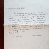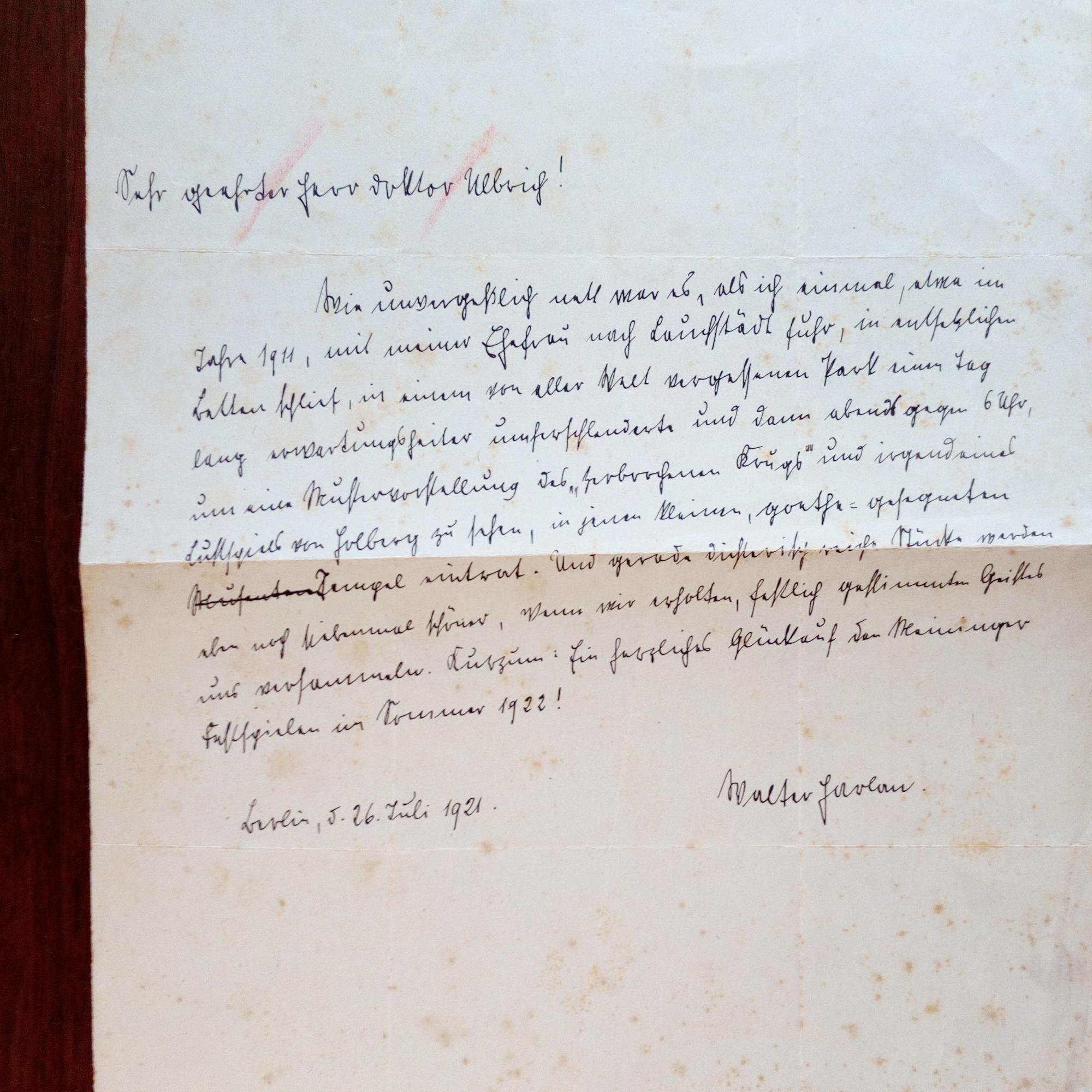 1867-1931, Bühnen-Schriftsteller - E. Brief mit U., Berlin 26.7.1921, ¾ S. gr. 4°, etw. altersfleckig. An den Regisseur am Meininger Hoftheater Franz Ulbrich (1885-1950). Erinnert sich an eine Begegnung 1911, verbunden mit einer "Mustervorstellung des 'zerbrochenen Kruges'". ...Ein herzliches Glückauf den Meininger Festspielen im Sommer 1922...