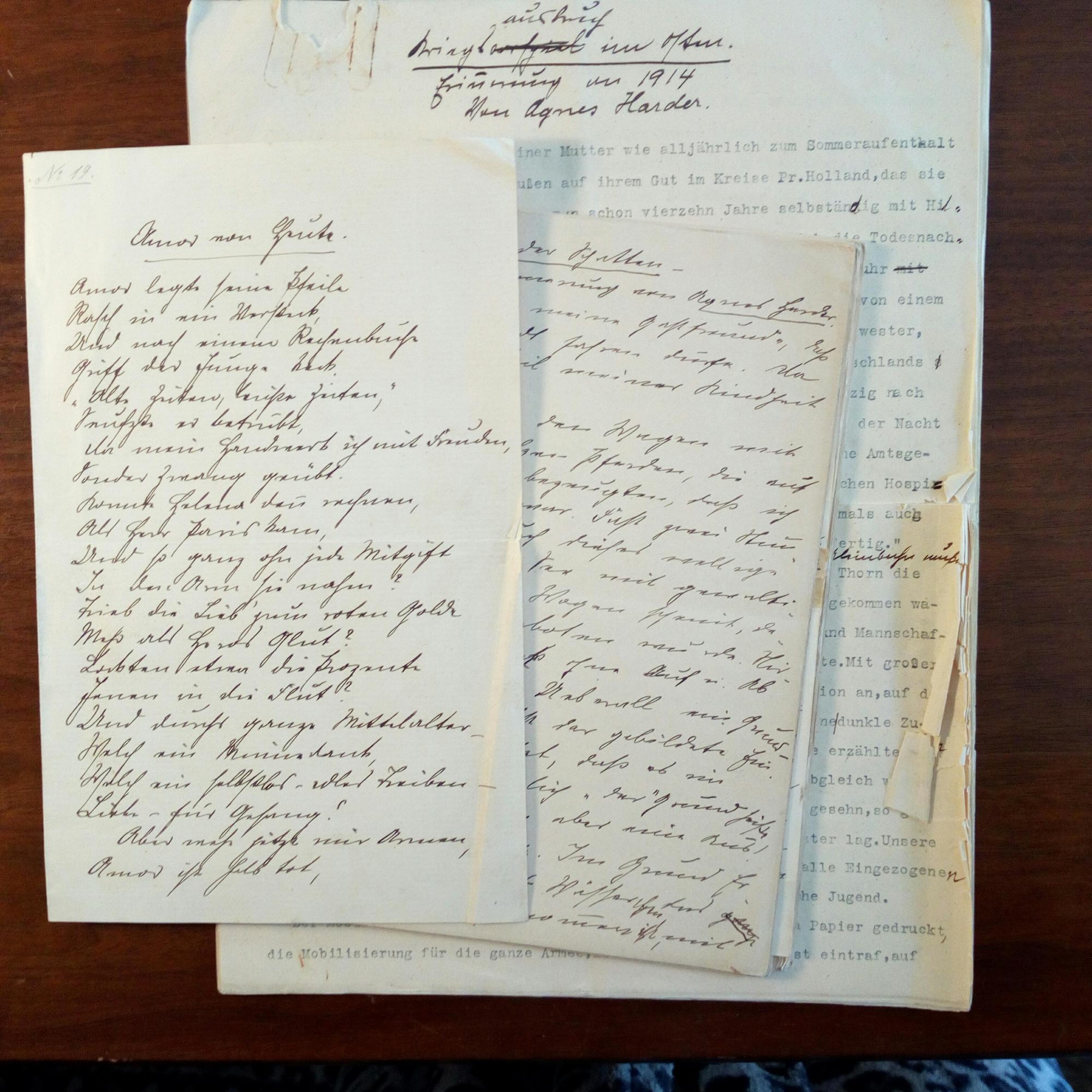 1864-1939, ostpreuß. Schriftstellerin - E. Gedicht (44 Z.) mit U., 2 S. gr. 8° "Amor von Heute". Es schließt: ...Amor, Amor, armer Junge,/ Ja du klagst mit Recht,/ Und es geht den alten Göttern/ Wahrlich herzlich schlecht./ Selbst der Venus einziges Söhnchen/ Quält sich um sein Brot,/ Wacklig ward sein goldnes Thrönchen/ Und es leidet Not." Dazu das Manuskript "Wie der Schatten" (aus ihrer Kindheit in Ostpreußen), mit U. am Kopf, kl. 4°, das Typoskript (mit vielen e. Korrekturen, Ende fehlt) "Kriegsende im Osten. Erinnerung an 1914", 5 S. 4° und zwei weitere abgeschlossene ohne U. (die Novelle "Fräulein Kunigunde von Kynast" und die Erzählung "Der Weihnachtsengel mit dem Aschenbecher") zus. 13 S. 4°. Alles mit kl. Gebr.spuren.