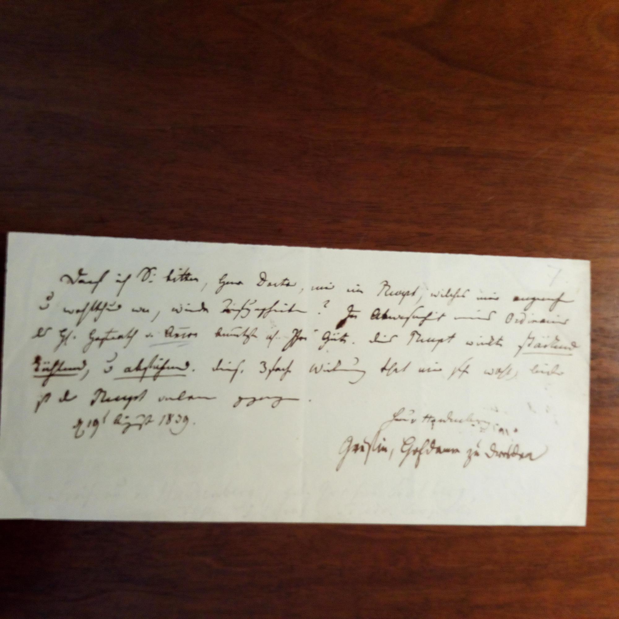 1788-1868, Schriftstellerin, Tochter des Schriftstellers und Staatsmannes Graf Friedrich Leopold zu Stolberg-Stolberg, Schwägerin von Novalis - E. Mitteilung mit U. (e. Zusatz "Gräfin, Hofdame zu Dresden"). 19.8.1839, ca. 1 S. kl. 8°quer (beschn.), ger. Gebr.spuren. An einen Arzt: ...In Abwesenheit meines Ordinarius des Hl. v. Ammon (Friedrich August, Ophtalmologe, Leibarzt von König Friedrich August II. von Sachsen) benötige ich Ihre Güte. Das Recept wirkte stärkend, kühlend u. abführend...leider ist das Recept verloren gegangen...
