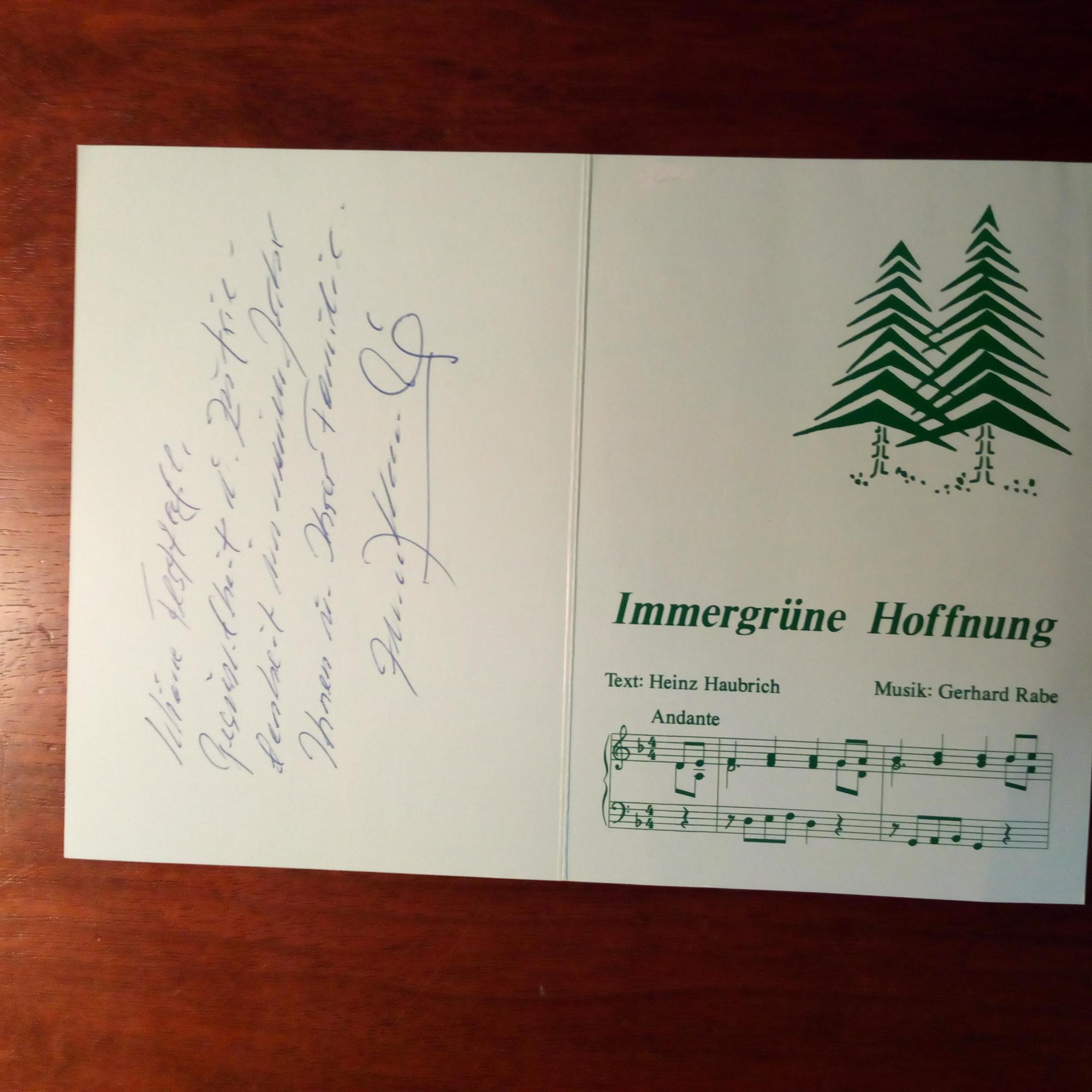1920-98, Chorleiter, Liedtexter und Musik-Verleger - Klappkarte mit Noten und Text seines Liedes "Immergrüne Hoffnung" (1989). Auf Rückseite e. Neujahrsgrüße und U.