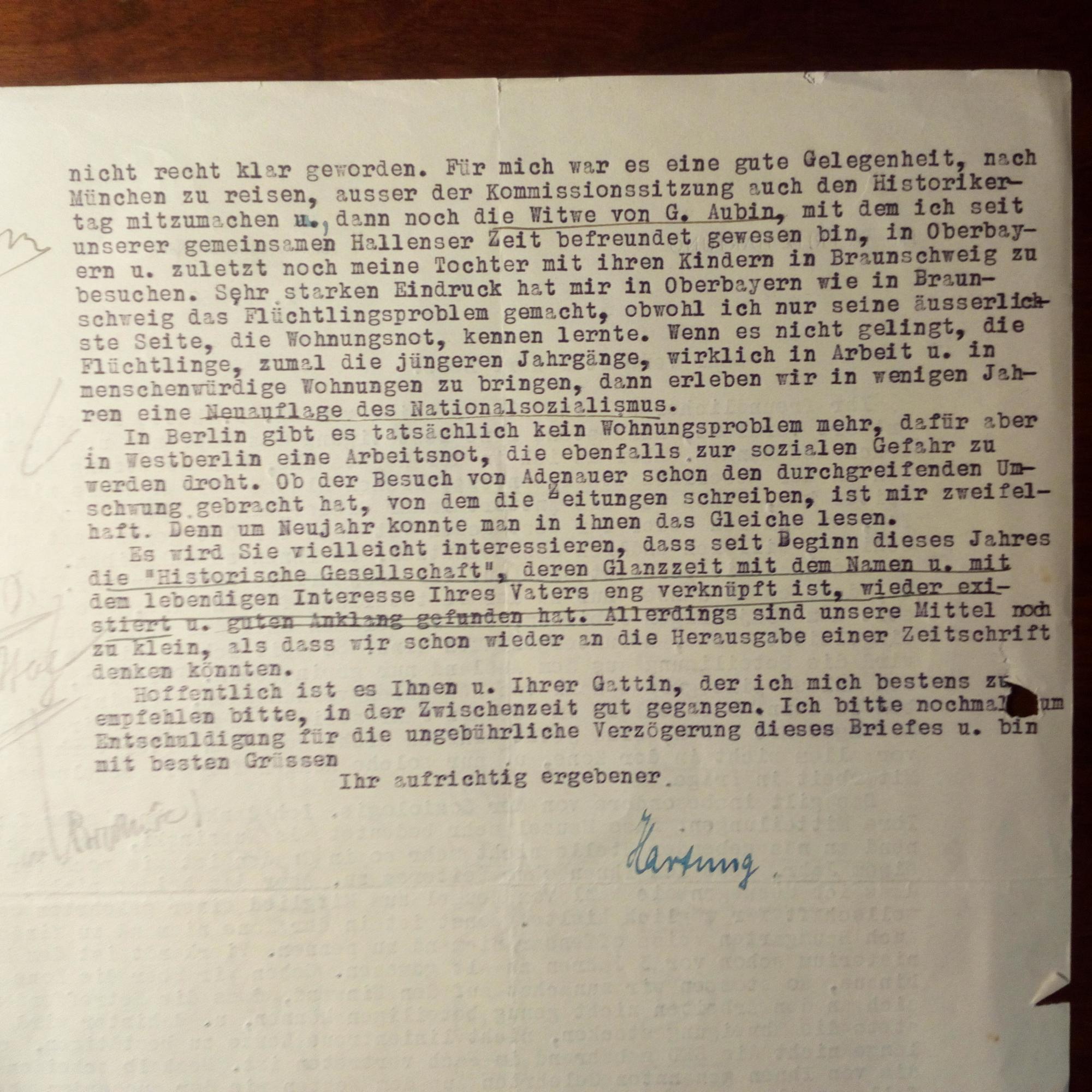 1883-1967, Historiker - Brief mit U., (Berlin) 1.5. 1950, 1 ½ S. 4°, dicht geschr. Typoskript, priv. Briefkopf, kl. Notizen und Bearb.spuren, gel. Inhaltsreich an den Nationalökonomen Friedrich Lenz (1885-1968) in Bielefeld: ...Die Akademie bereitet sich auf ihr 250jähriges Jubiläum vor. Ich fürchte, dass es im Ganzen nur zu der Feststellung führen wird, wie weit wir...heruntergekommen sind...Sehr starken Eindruck hat mir in Oberbayern wie in Braunschweig das Flüchtlingsproblem gemacht...Wenn es nicht gelingt...die jüngeren Jahrgänge, wirklich in Arbeit u. in menschenwürdige Wohnungen zu bringen, dann erleben wir in wenigen Jahren eine Neuauflage des Nationalsozialismus...