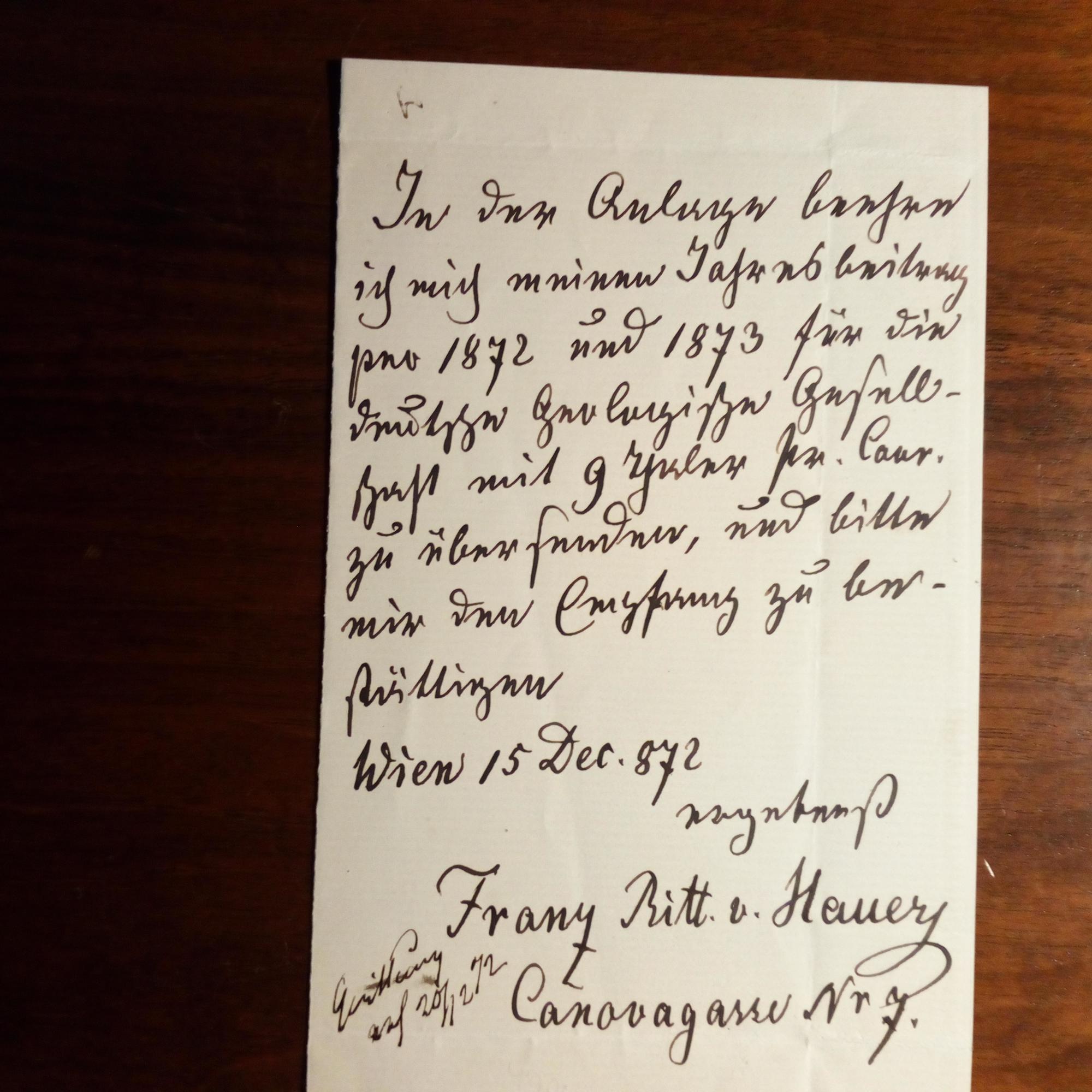 1822-99, österr. Geologe - E. Mitt. mit U., Wien 15.12.1872, 1 S. kl. 8°. Begleitschreiben zu seinem "Jahresbeitrag pro 1872 und 1873 für die deutsche Geologische Gesellschaft...".