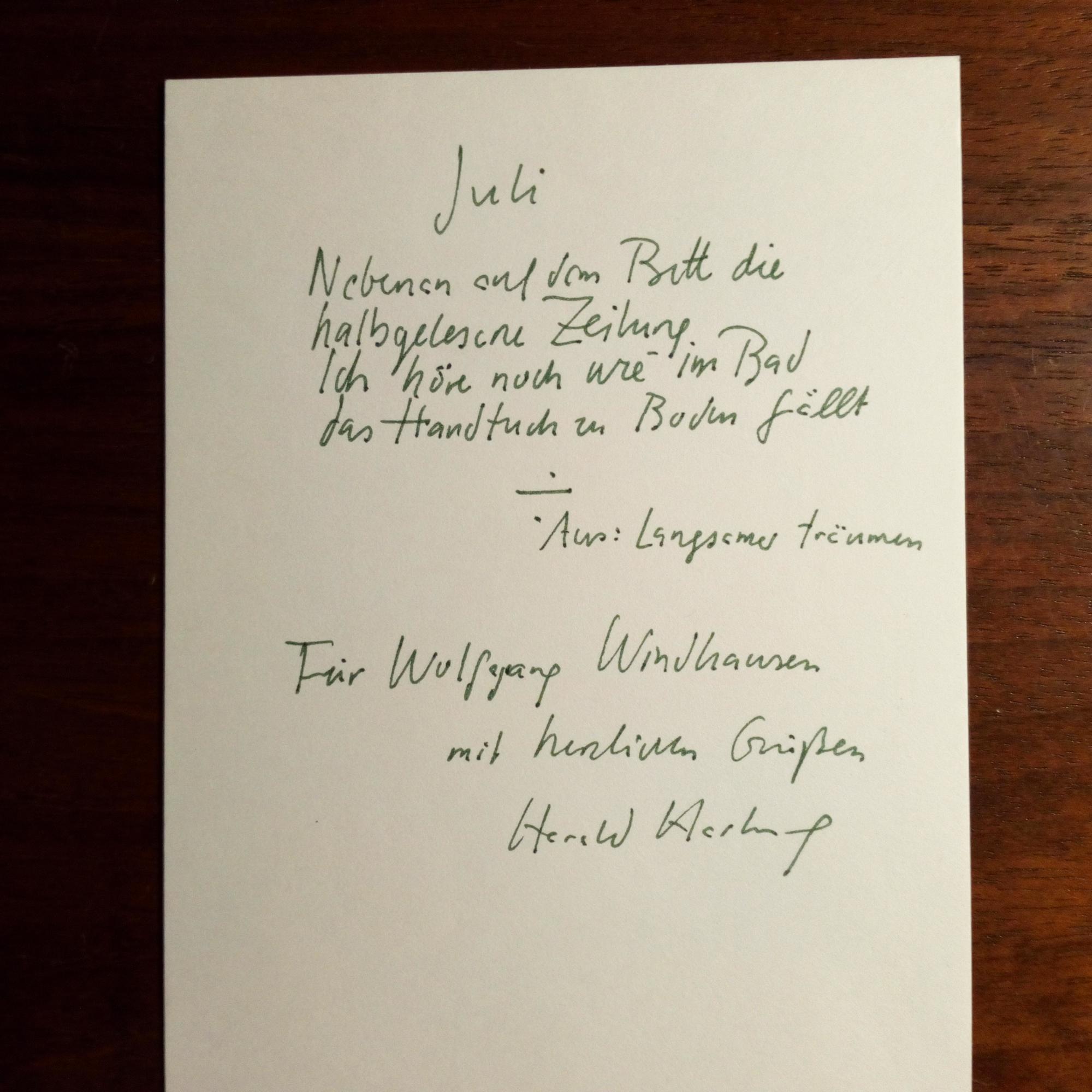 1932-2025, Lyriker und Kritiker - Karte mit e. Gedicht ("Juli", 4 Z., aus "Langsamer träumen") mit Widm. und U.
