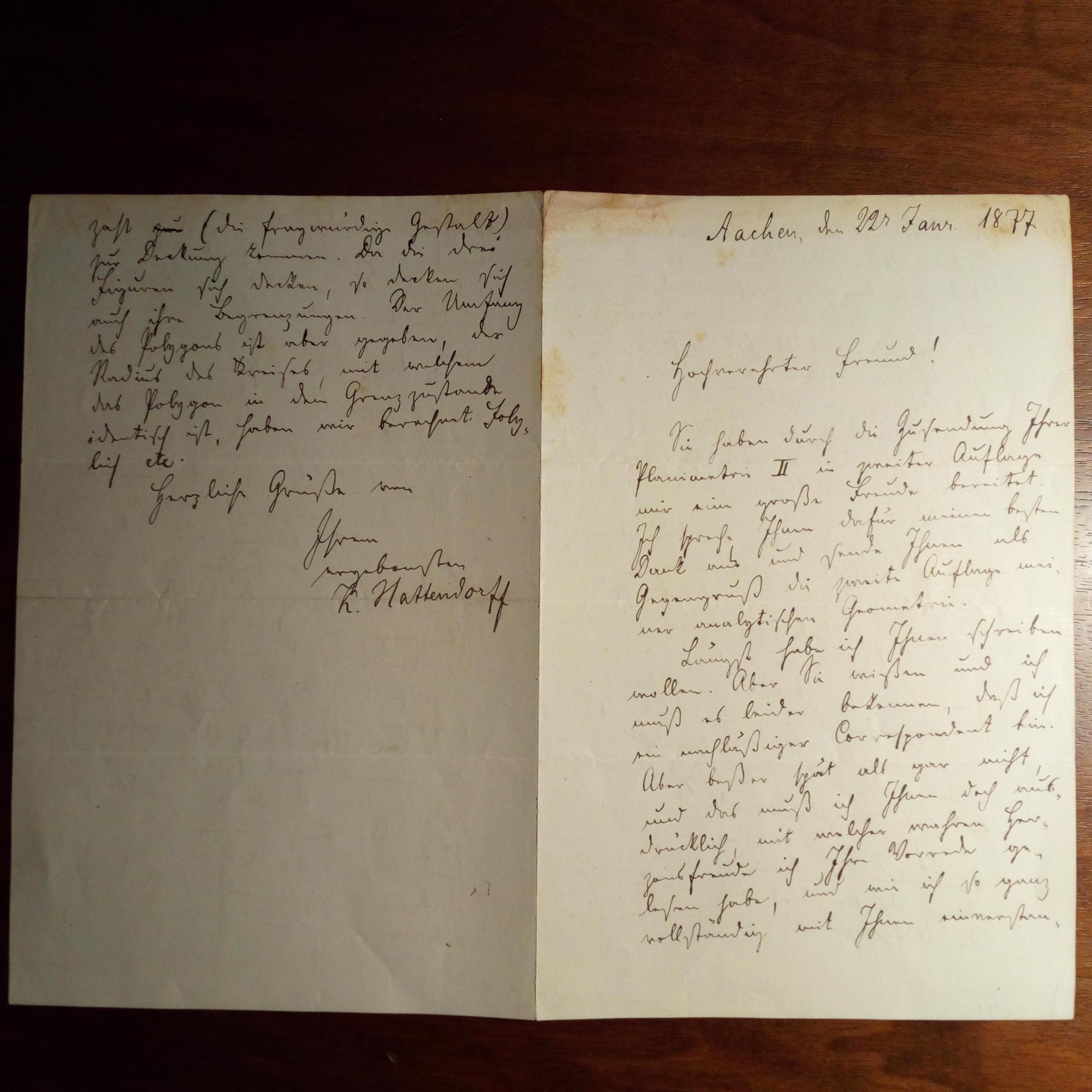 1834-82, Mathematiker - E. Br. m. U., Aachen 22.1.1877, 3 ½ S. 8°, kl. Gebr.spuren. Wohl an den Mathematik-Schulbuchautor Thomas Eschweiler, der seine "Planimetrie II." geschickt hatte: Sendet seine "Analytischen Geometrie" u. geht ausfürl. darauf ein.