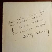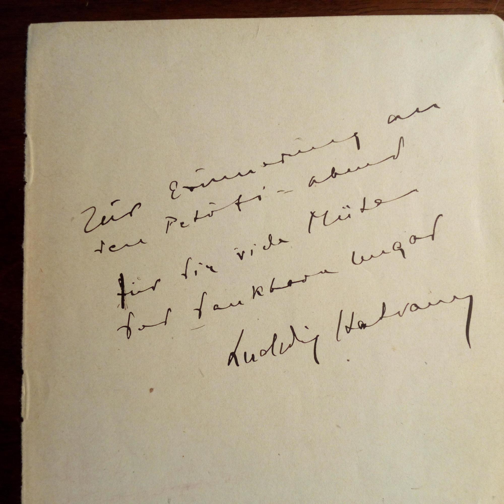 1880-1961, ungar.-dt. Baron, Kulturmäzen und satir. Schriftsteller - 8°-Blatt m. e. Eintrag u. U. Zur Erinnerung an einen "Petöfi-Abend": ...der dankbare Ungar... Beiliegt Kärtchen mit U. von der Schauspielerin Valery von Hatvany