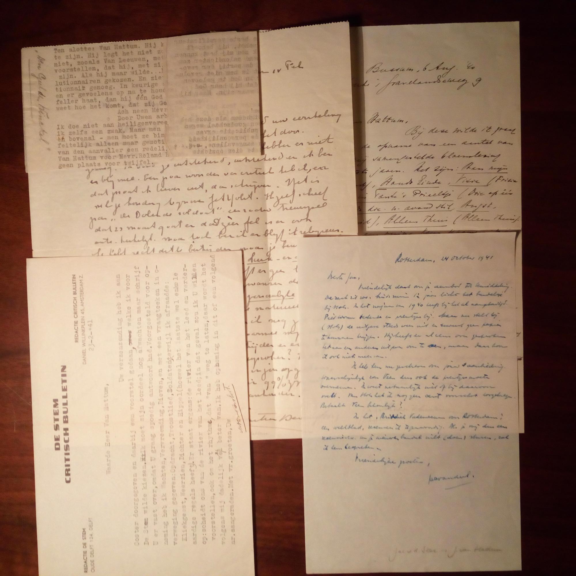 1900-81, niederländ. Schriftsteller und Literatur- historiker - 4 Briefe mit U. an ihn, 1940/41, alle dicht geschr., von den Schriftst. Martin Beversluis (1 S. 4°, e., mit mont. kl. Typoskript), Nico Dankersloot (Typoskr., 1 S. 8°quer, mit Br.kopf der zeitschr. "De Stem", Delft), Friedrich Wilhelm von Heerikluizen (e., 1 S. 4°) und Jacob van de Ster (e., 1 S. 8°), inhaltl. Details zu einer literaturwiss. Publikation.