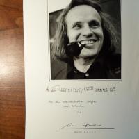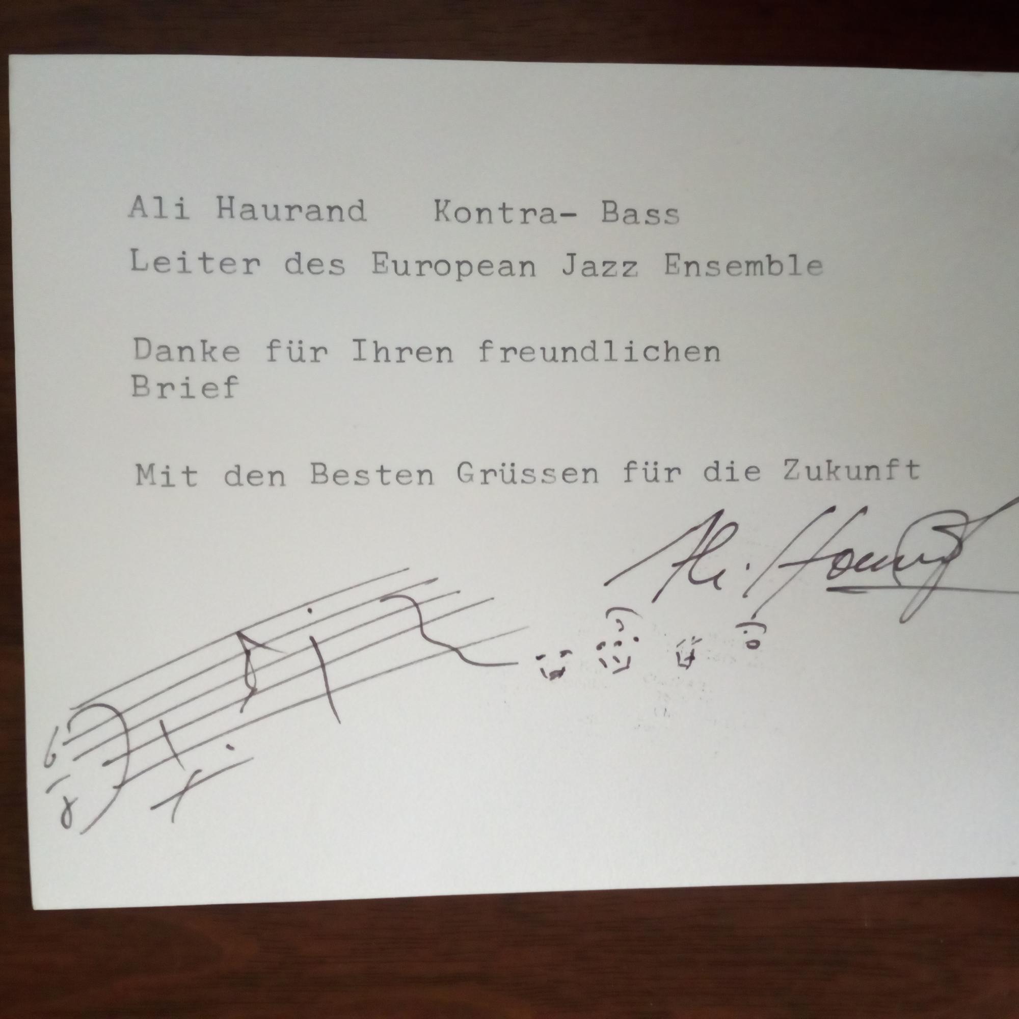 1943-2018, Jazz-Bassist und Bandleader - Privates Pfo. (bei den Jazztagen Leipzig 1982) mit U. Auf Rückseite e. Erläuterung, U., und e. absichtlich zerlaufene Notenzeile (2 Takte).