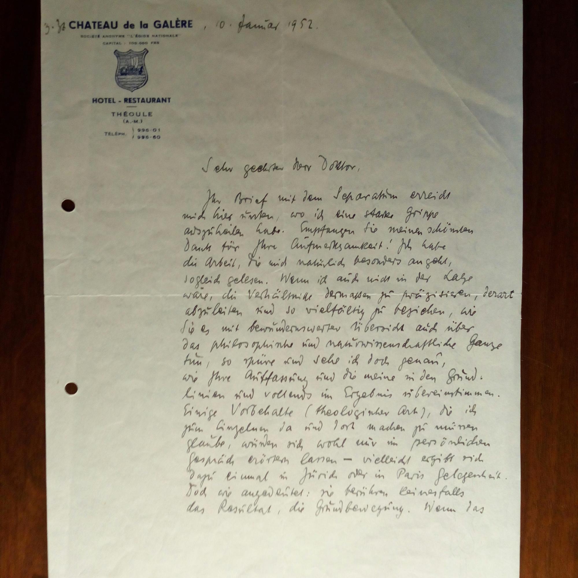 1982-1957, Kunstkritiker, Kulturhistoriker und Diplomat - E. Brief mit U., Tutzing 14.12.1943, Kopierstift, 1¾ S. 4°, etw. gebräunt, mit postal. Umschlag. An die Dichterin "Marylou" (Prinzessin Marie Luise zu Solms-Braunfels, 1914-85, bei Wetzlar). Dankt für einen Brief, über Krankheiten, und ...beschäftige mich mit Séguy und Baudelaire... Die 2. S. ist seine Übersetzung des Gedichtes "Ikarische Klage" von Baudelaire (4 Str. à 4 Z.). Beiliegen: E. Brief mit U., 1 ½ S. 4°, kl. Schrift, 10.1.1952, Briefkopf des Hotels, gel. An den Schriftsteller und Verleger Felix Noeggerath (1885-1960) in München: Dankt für eine "Studie": ...Wenn das Zwingend-Beweisende Ihrer Argumentation nun bloß auch wirkend in die Praxis der Maler übergreifen wollte!... Und: E. Brief mit U., (Chiemsee) 18.4.1952, 1 S. 4°, Briefkopf des Hotels, 1 S. 8°. An den christl. Schriftsteller und Verleger Ludwig Glock (1905-85) in Nürnberg. Stellt "das Honorar für den Zweitdruck" dem "Nürnberger Aufbau-Fonds" zur Verfügung.
