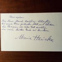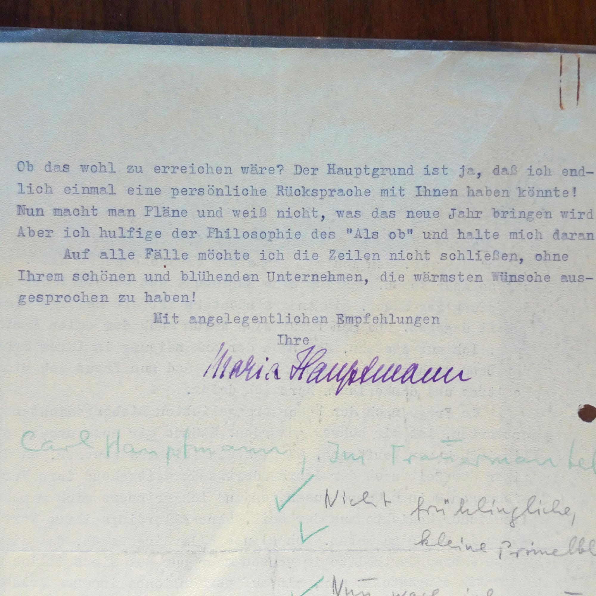 geb. Rohme, 1881-1961, Malerin - Brief mit U., Markkleeberg 9.1.1954, 1 ½ S. 4°, dicht geschr., gel., ger. Gebr.spuren. An den Verleger Max Niedermayer (1905-68) in Wiesbaden, der nach den 3 schönsten Liebesgedichten für eine Anthologie gefragt hatte. Sie wählt diese aus einem Band ihres verst. Mannes Carl Hauptmann (1858-1921) "Dort wo im Sumpf die Hürde steckt" aus ("Verse aus der Zeit unserer ersten Begegnung in Worpswede") und bittet um Unterstützung für eine Lesereise in den Westen. ...ich huldige der Philosophie des "Als ob"... Mit e. Notizen des Adressaten.