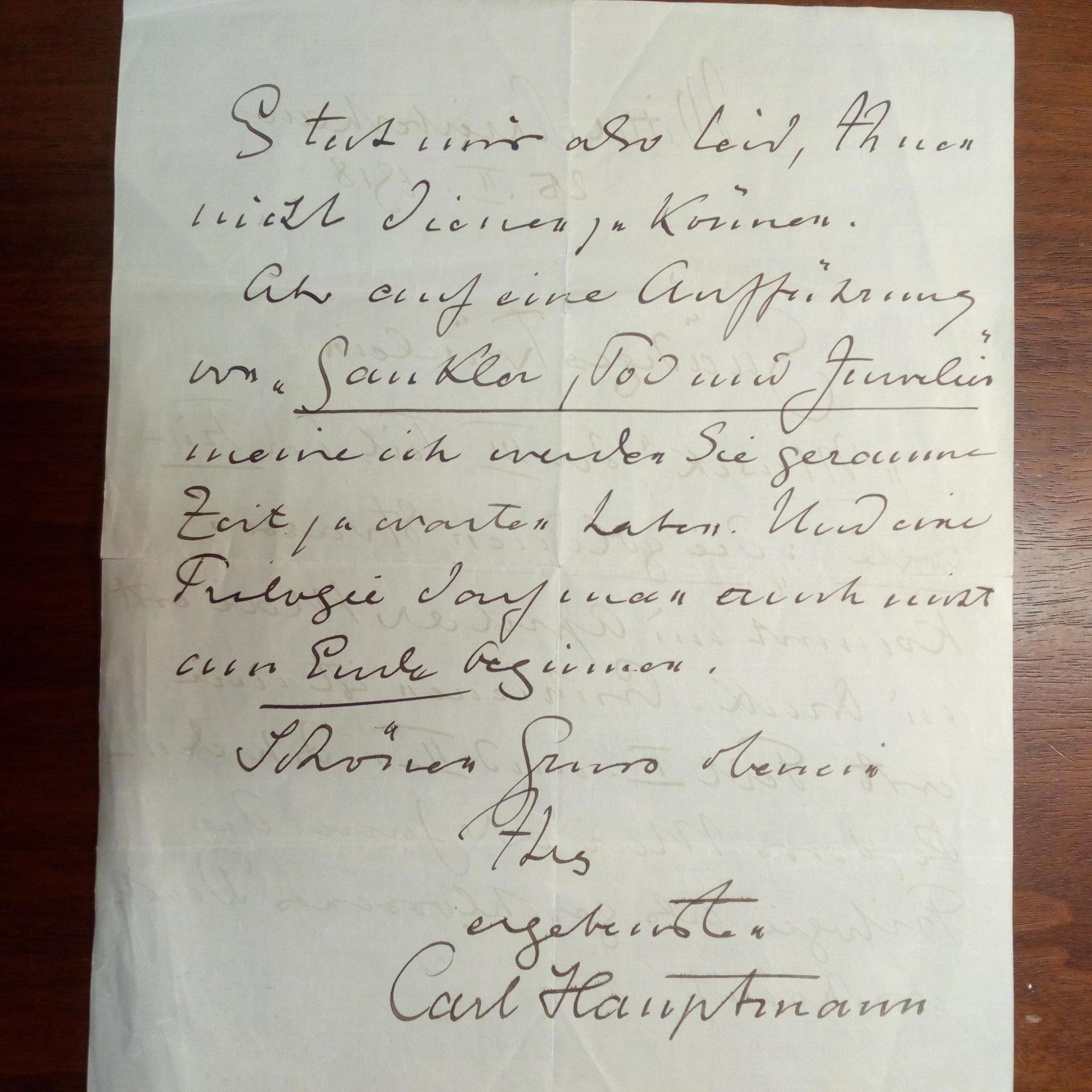 1858-1921, Schriftsteller, Bruder von Gerhart H. - E. Br. m. U., Schreiberhau (heute poln.) 25.2.1918, 2 S. 4°, Faltspuren. An ein Frl. betr. seiner Trilogie "In goldenen Strassen": ...auf eine Aufführung von "Gaukler, Tod und Juwelier" ... werden Sie geraume Zeit zu warten haben...