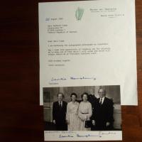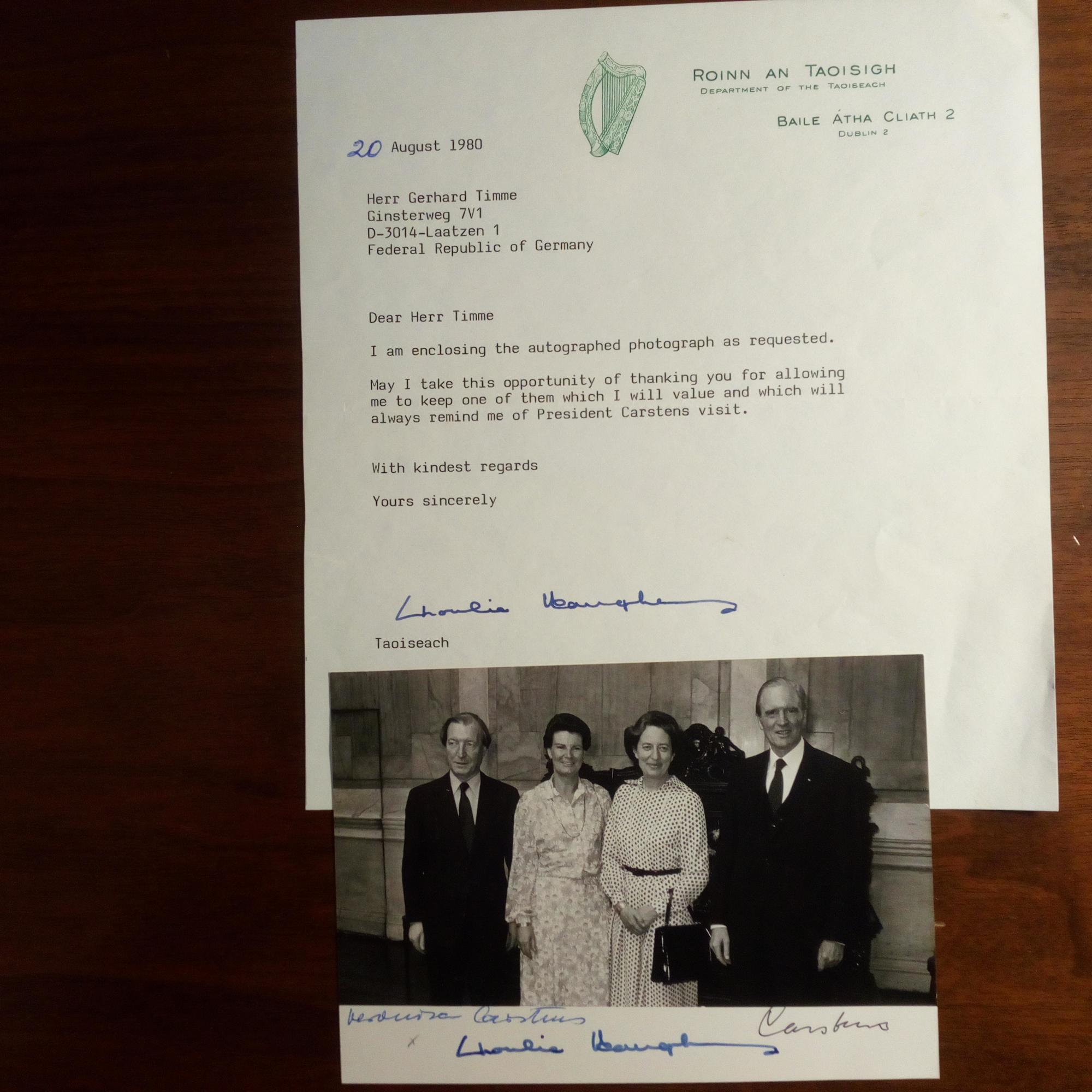 1925-2006, "Taoiseach" (Premierminister) von Irland - Foto (m. Gattin beim Staatsbesuch in Dt., zus. m. dem Bundespräs.paar) m. U., U. auch von Karl und Veronika Carstens. Mit Begleitbr. m. U., (Dublin) 20.8.1980, Br.kopf u. weiterer kl. Br. m. U.