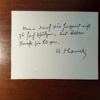 1898-1986, Schriftsteller und Prediger - 1. E. Brief mit U., Osterhof (bei Bremen) 17.3.1925, e. postal. Umschlag angeheftet. Sendet dem Historiker Friedrich Thimme in Göttingen ein "Büchlein. Das soeben erscheint". 2. Blatt aus einem Album mit U. und D. 1935. 3. U. auf Vortitel seines Büchleins "Martin. Geschichten aus einer glücklichen Welt", Luxusausgabe der Oltner Bücherfreunde 1949. Dazu Biographieblatt. 4. Kl. Verlagsprospekt mit U. auf Pfo. (um 1956). 5. 7 e. postal. Postkarten (eine mit angeheftetem privatem Pfo.), gedr. Blatt mit Gedicht und e. Zeilen, und e. Brief (1 ½ S. 8°), mit e. postal. Umschlag. Alles mit U. 4.2.1958-23.2.1978 an Pastor Udo Kortmann in Emden mit Details zu Lesungen und Persönliches. 6. E. Briefkarte mit U., z. Zt. Meran 2.4.1961. Freut sich über die gute Aufnahme einer "Mappe". 7. E. Weihnachtskarte mit U., Bremen 1963. Dankt dem Künstler Heinrich Kiefer für eine Grafik. 8. E. Übersetzung eines Gedichtes von Toyotama Tsuno (5 Z.) mit U., Dyllenhoff (Bremen) 1964. 9. Pfo. (8°) mit U., auf Rückseite Widm., U. und D. 1966. 10. E. Brief mit U., 1966, ¾ S. 4°, Briefkopf. Sendet der "Schwestern-Revue" in München "Die vier Kalenderblätter". 11. Kl. Blatt mit e. Vierzeiler und U., mit e. postal. Umschag (U. im Abs.). 12. E. Brief mit U., 1969. An den Münchner Verl.buchhändler Hanns Arens: Ist mit dem Abdruck eines seiner Texte in der Anthologie "Geliebtes Bremen" einverstanden. 13. E. Brief mit U., 1973. Dankt für Wünsche. Mont. zus. mit Karte mit mont. Druck-Pfo mit U. und gleichem D. 14. E. Brief mit U., 1974, ¾ S. 8°. An eine Sammlerin. Mit e. postal. Umschlag. 15. E. Brief mit U., 1974, ½ S. 8°. Dankt für Wünsche. 16. E. Brief mit U., 1975, 1 S. 8°. Dankt für Unterlagen zu Zenta Maurina und zu den aktuellen Arbeiten der Adressatin. 17. Pfo. mit U. und D. 1978. 18. 4°-Blatt mit e. Vierzeiler (wie 11) mit Widm. und U., 1981. 19. Karte mit e. Zitat (2 Z.), Widm. (1983) und U. für Pfarrer Walz in Gladenbach. (zus. 28 Stücke).