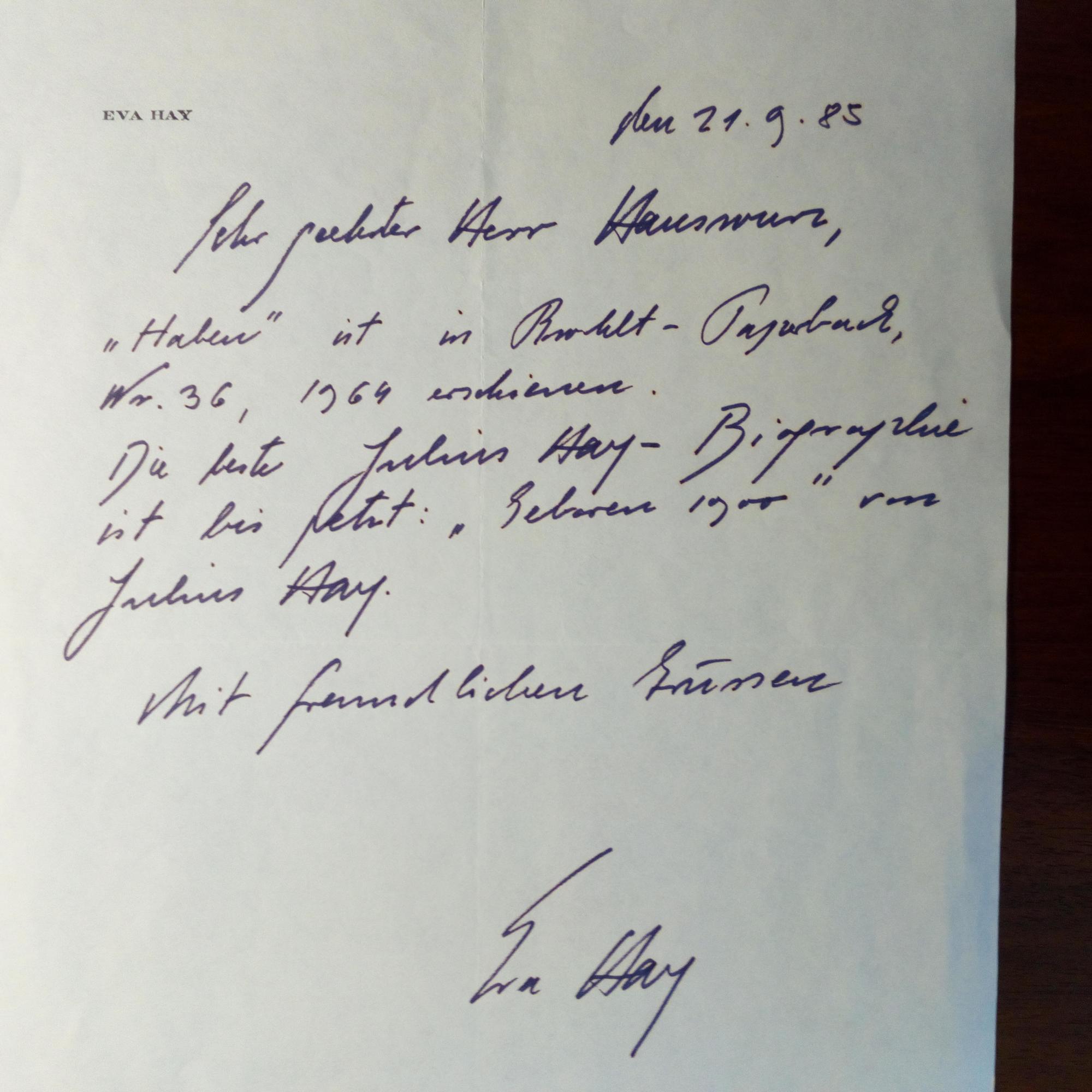 1900-75, ungar.-österr. kommunist. Dramatiker - Karte mit e. persönl. Dank für Wünsche zum 70. Geb. und U., Brisago 16.5.1970. Dazu: Karte mit e. Widm. und U. mit gleichem Datum. Beiliegt: E. Brief mit U. seiner Witwe, der ungar. Kommunistin Eva Hay (1915-2007), (Ascona) 21.9.1985, ¾ S. 4°, gedr. Name am Kopf, mit postal. Umschlag. Gibt Auskünfte über Bücher ihres Mannes: u.a. "Haben"...Die beste Julius Hay-Bioghraphie ist bis jetzt: "Geboren 1900" von Julius Hay...