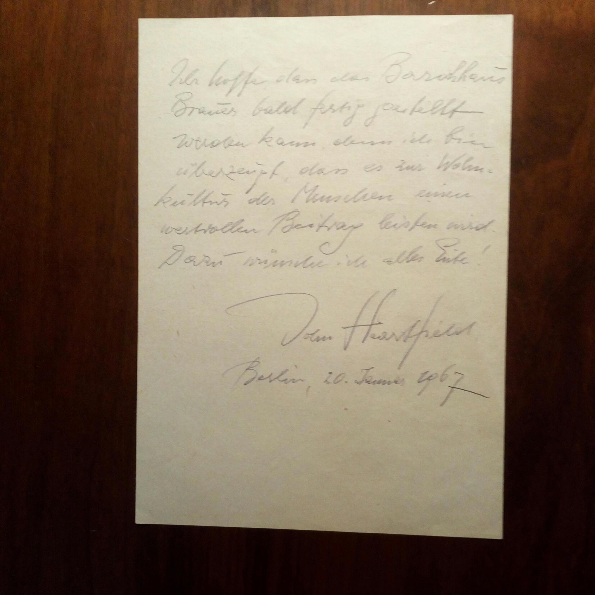1891-1968, Maler, Graphiker und polit. Collagist, Bruder des Publizisten und Verlegers Wieland Herzfelde - E. Schreiben mit U., ¾ S. 8°, Bleistift, Berlin 20.1.1967, auf Rückseite eines Blattes zum "Barockhaus Brauer". Wünscht dem Altenberger Kunsthändler Julius Brauer alles Gute zur hoffentlich baldigen Fertigstellung davon.