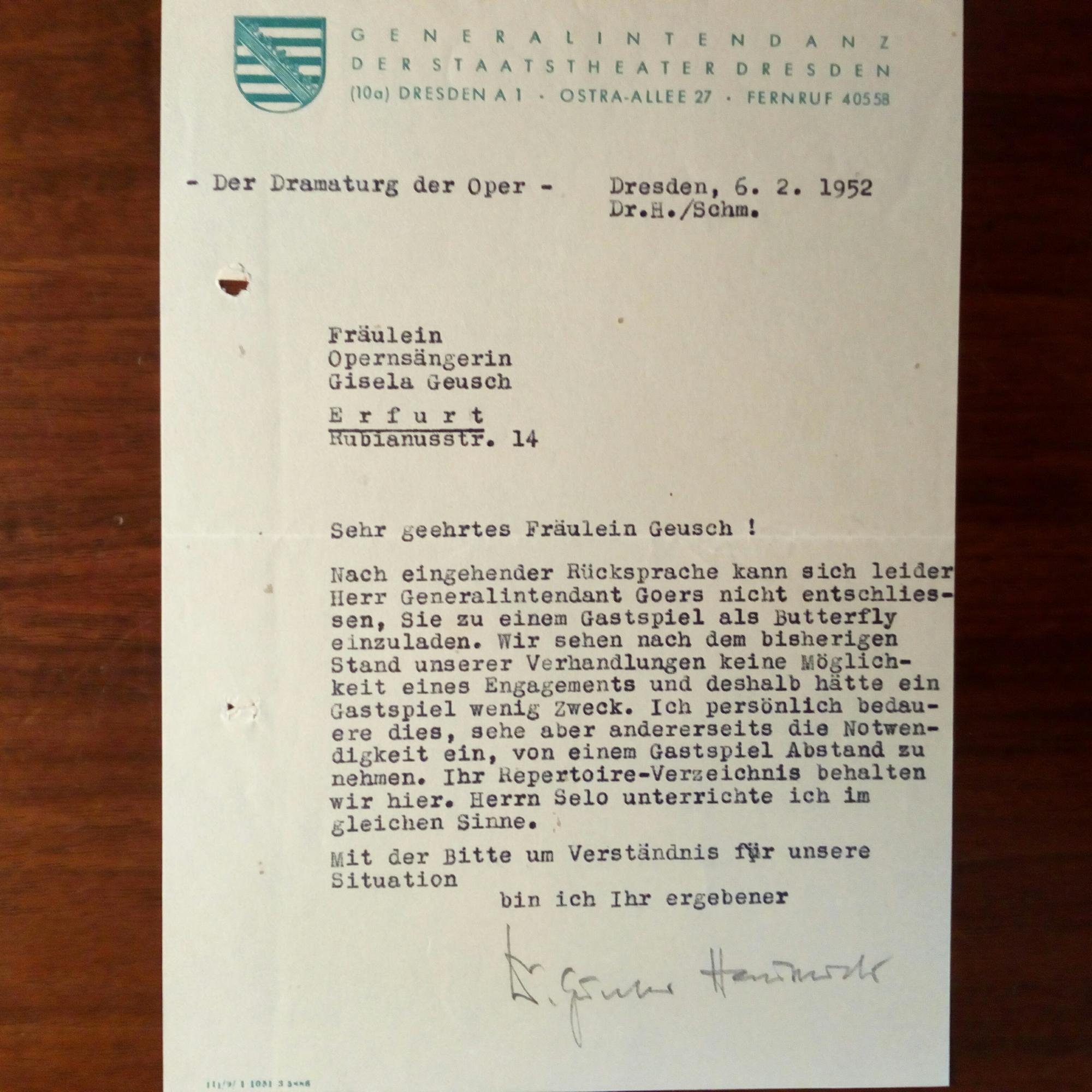 1908-74, Musikschriftsteller und Opern-Intendant - Br. m. U. (Bleistift), Dresden 6.2.1952, 1 S. 8°, Br.kopf der Generalintendanz der Staatstheater Dresden, gel. Sagt der Sängerin Gisela Geusch in Erfurt ein "Gastspiel als Butterfly" ab.