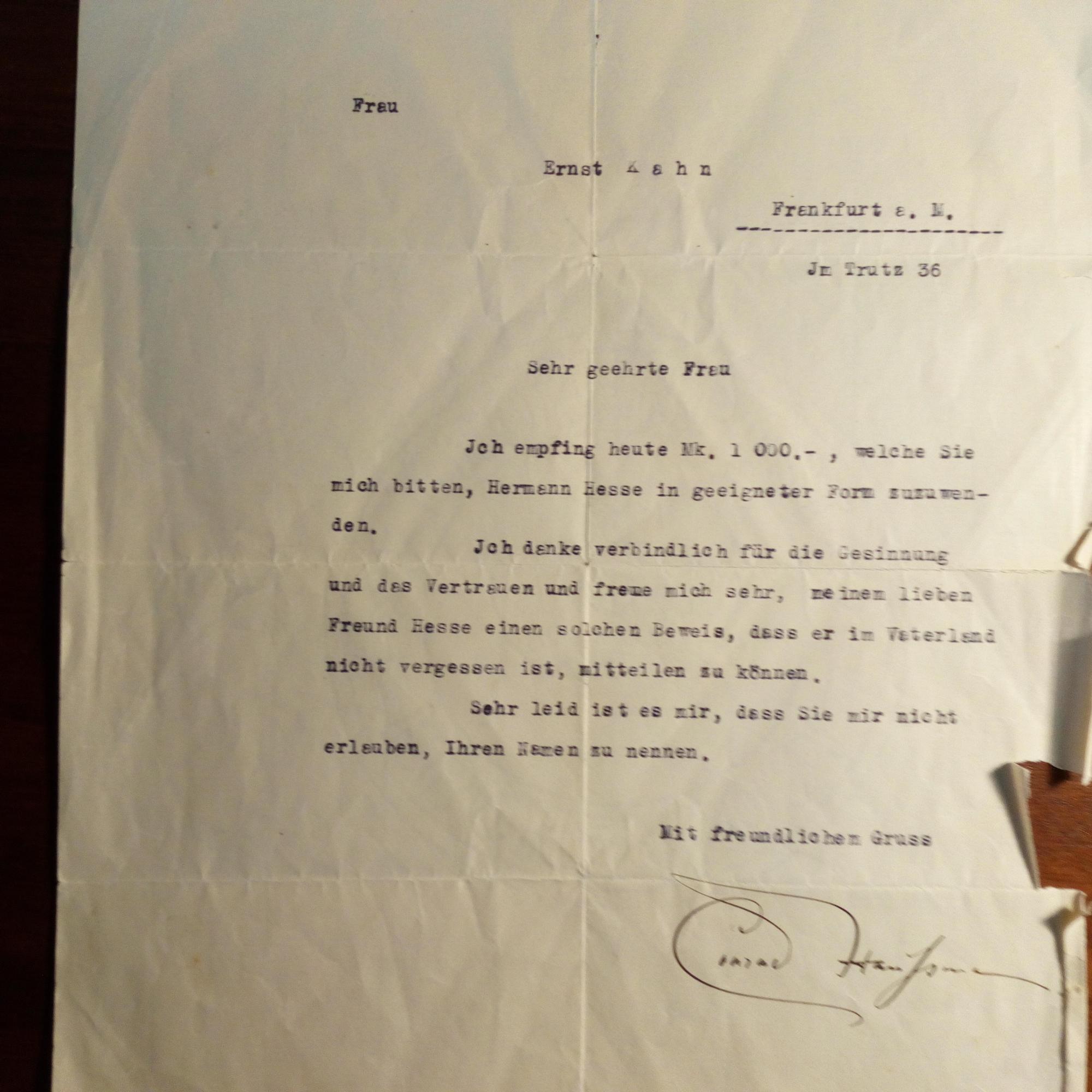1857-1922, Politiker und Publizist - Br. m. U., (Stuttgart) 7.1.1921, 1 S. 4°, Br.kopf, Altersspuren. An die Frau des Publizisten Ernst Kahn (1884-1959) in Frankfurt: Er habe eine Spende von 1000,- Mark an H. Hesse weitergeleitet: ...freue mich sehr, meinem lieben Freund Hesse einen solchen Beweis, dass er im Vaterland nicht vergessen ist, mitteilen zu können... Beiliegt ein e. postal. Umschlag von Hermann Hesse.