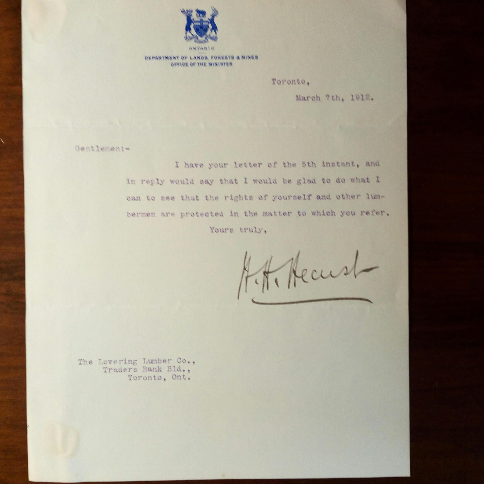 1864-1941, US-Politiker, ab 1914 Premier-minister von Ontario - Brief mit U., Toronto 7.3.1912, ¾ S. 8°, Br.kopf als Minister "of Lands, Forests & Mines": ...I would be glad to do what I can to see that the rights of yourself and other lumbermen are protected...