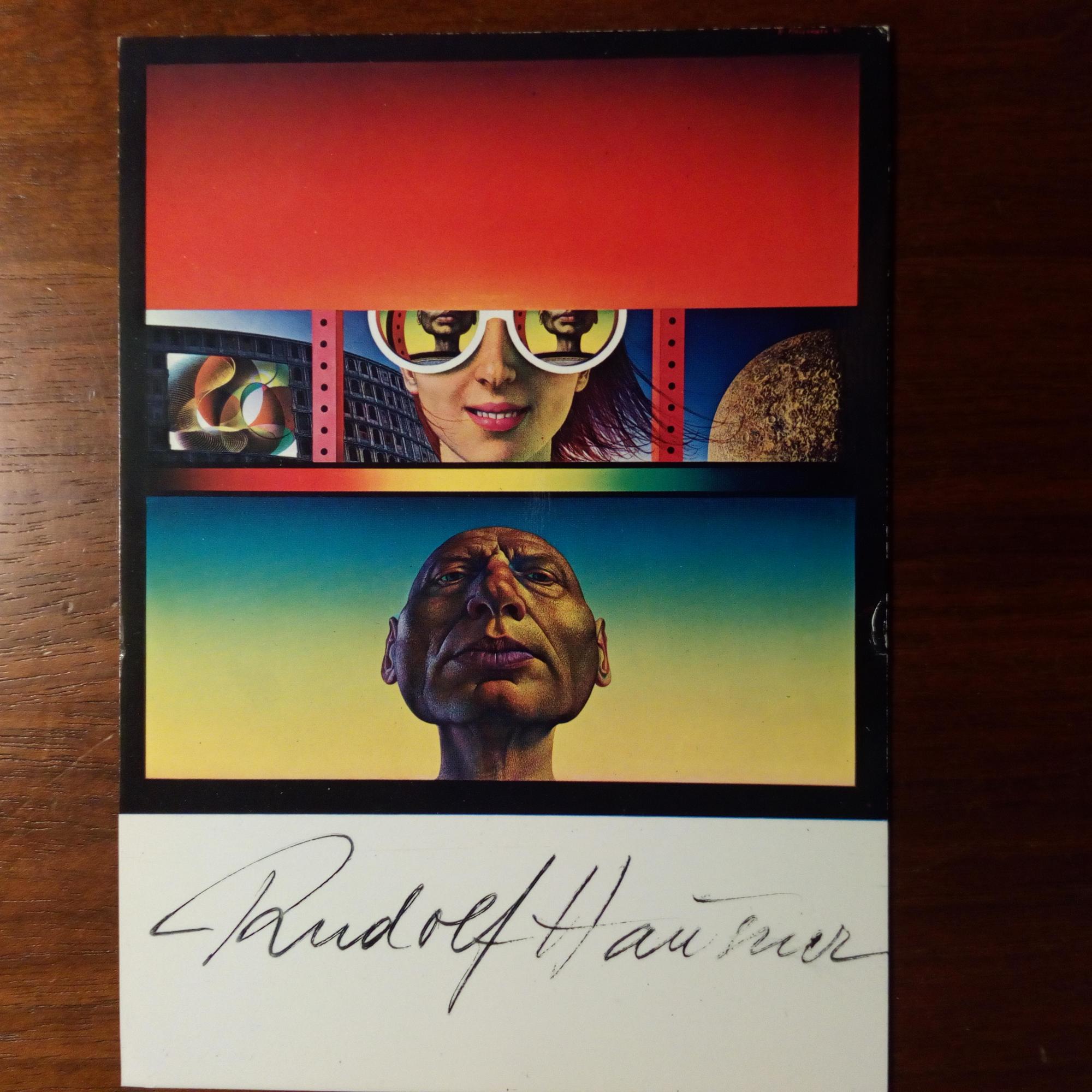 1914-95, österr. Maler und Graphiker (Phantast. Realismus) - Werk-Ansichtskarte ("Adam vis-a-vis", 1970) mit U. Beiliegen: ähnl. ("Narrenhut", 1955) mit U. auf Rückseite, und Prospekt zur österr. Briefmarkenserie "Adam" mit mont. Marke und U. (1978).