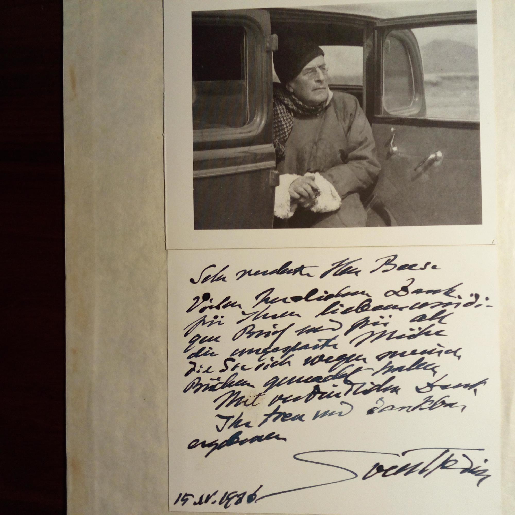 1856-1952, schwed. Geograph und Reiseschriftsteller - 1. E. Brief mit U., Stockholm 10.11.1902, 2 ¾ S., kl. 4°, ger. beschäd. An Prof. Georg Gerland (1833-1919) in Straßburg. Sagt einer Einladung zu: ...habe ja viele sehr angenehme Erinnerungen aus Ihrer Stadt... 2. E. Briefkärtchen mit U., Stockholm 24.3.1917, 2 S. schw. Rand. ...Fräulein Eva Sondin begibt sich nach Wien um in die dortige Krankenpflege einzutreten...wäre sehr dankbar für jede...gezeigte Liebenswürdigkeit... Beiliegen 2 histor. Privat-Fotos von ihm. 3. E. Brief mit U., Dresden 7.10.1918, 1 ¾ S. kl. 8°, Briefkopf des "Palast Hotels Weber". Bittet ein "Fräulein", für Eva Sondin um Erlaubnis, ein paar Tage in Dresden zubringen zu dürfen, ...um meine Cousine Anna Berlin die beim Eisenbahnunglück...schwer verletzt worden ist, zu pflegen... 4. Pfo (Atelier Rönngren, Stockholm) mit U. 5. E. Briefkarte mit U., 15.4.1926, 1 S. Dankt einem Sammler für die "ungesparte Mühe, die Sie sich wegen meiner Bücher gemacht haben...", mont. unter Druck-Pfo. (im Auto, bei seiner 3. Expedition) auf 4° (ursprüngl. war beides eine Klappkarte). 6. Klappkarte: Vorderseite: anderes ähnl. privates Pfo. Innen: E. Briefkarte mit U., 1.10.1938. An Bauer: ...das Buch Flemig kannte ich sehr gut. Gott sei Dank dass der geniale Führer den Krieg fern halten konnte... 7. E. Brief mit U., Stockholm 25.5.1952 (ca. ½ Jahr vor seinem Tode), 1 S. 4°, dicht geschr., gel., kl. Altersspuren. An die österr.-dt. Ethnologin Barbara Pischel (1912-99) in Berlin: Muss die Mitarbeit an einem Projekt absagen.