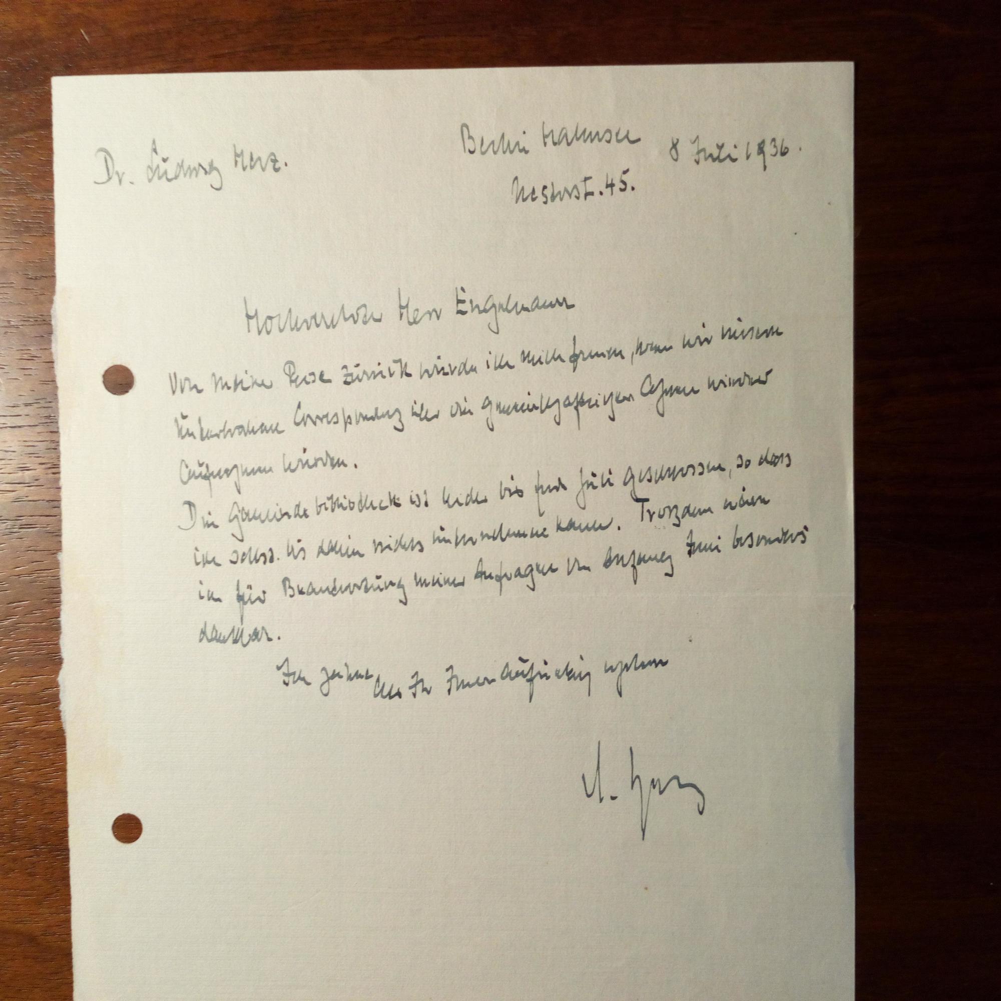 1863-1942, Jurist und Historiker - E. Brief mit U., Berlin 8.7.1936, ¾ S. 8°, kl. Schrift. An den Berliner Lehrer, Historiker und Heimatforscher (Niederlausitz) Emil Engelmann (1861-1945) in Berlin: ...würde mich freuen, wenn wir unsere unterbrochene Correspondenz über die gemeinschaftlichen Ahnen wieder aufnehmen würden...
