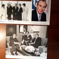 1918-97, Präs. von Israel - 2 x dasselbe Farb-Pfo. mit U. in hebr. Schrift und eines in latein. Schrift (letzteres mit kl. Widm. und Jahr 1984), mit Ded.blatt seines Büros. Beiliegen: Foto (ca. 4°, mit Helmut Kohl) mit U. und Foto (mit dem Präsidenten-Ehepaar) mit U., weitere U. von Marianne, Autopen-U. von Richard von Weizsäcker.