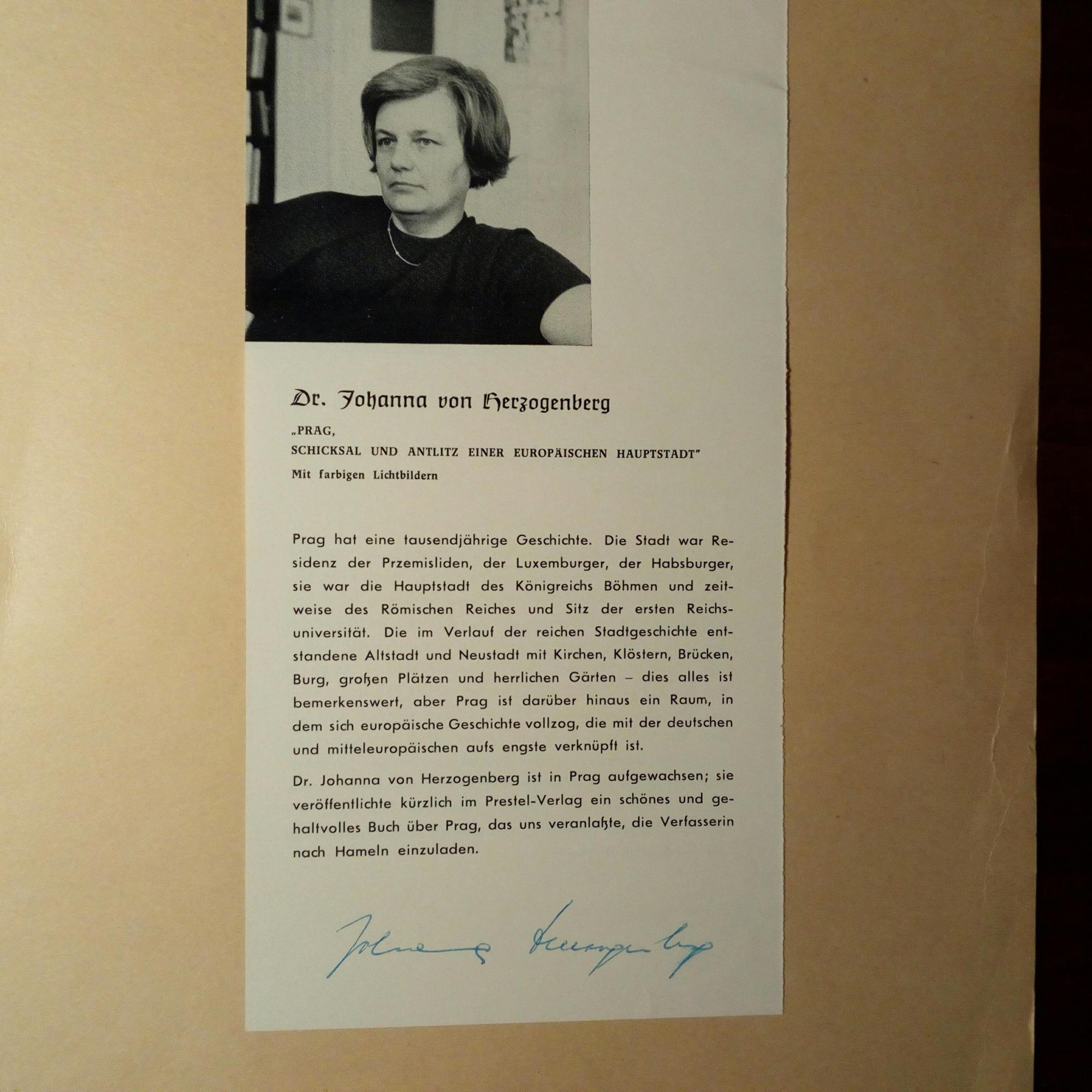 1921-2012, Kunsthistorikerin und Schriftstellerin - U. auf mont. Zeitungsausschnitt m. Pfo. (Einladung zu einer Lesung mit Lichtbildern aus ihrem Buch über Prag, ersch. 1952).