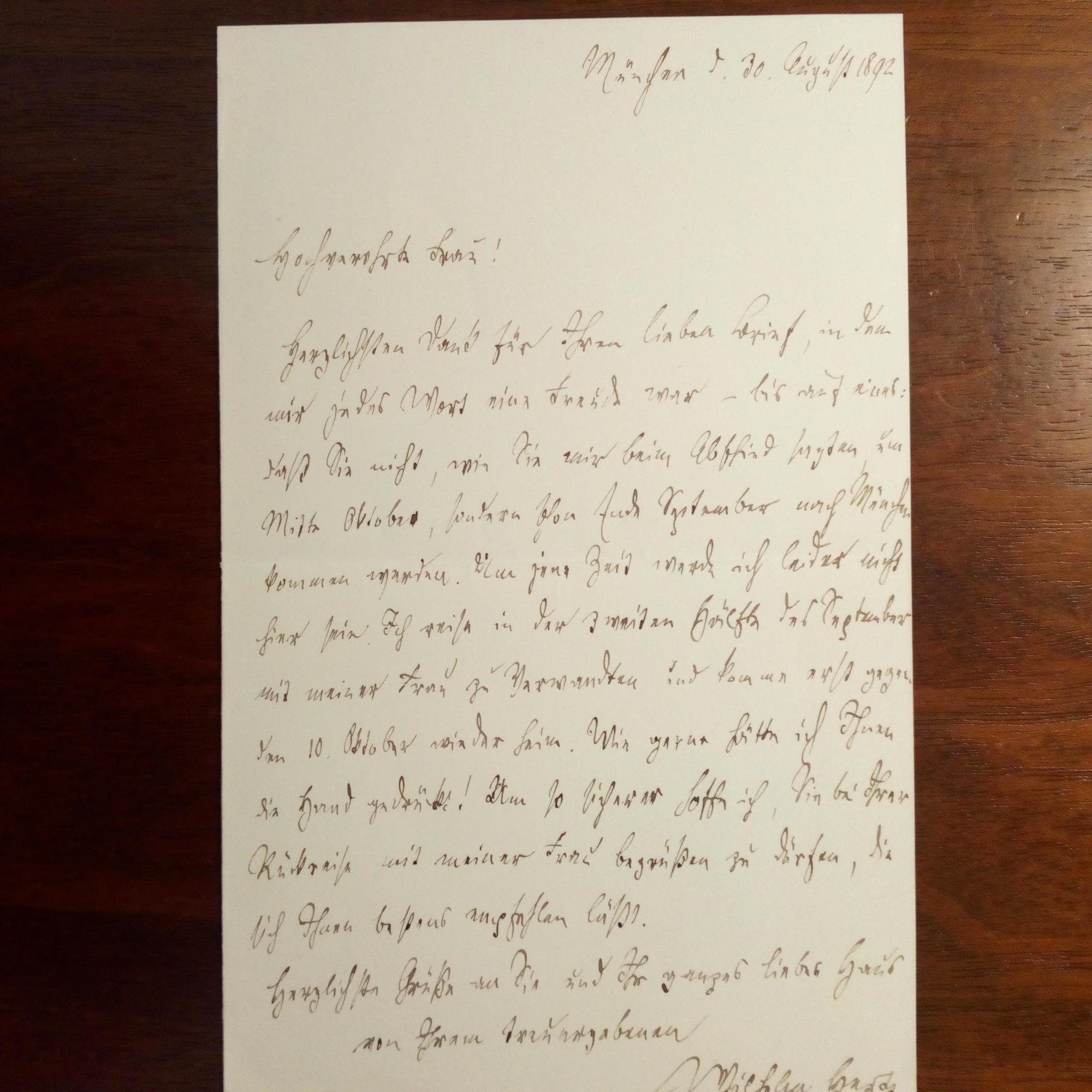1835-1902, Dichter und Sagenforscher - E. Br. m. U., München 30.8.1892, 1 S. 8°. An Cosima Wagner (1837-1930, Witwe des Komp. Richard W.): Bedauert, sie nicht in München treffen zu können u. bedankt sich für einen Br., "in dem mir jedes Wort eine Freude war...".