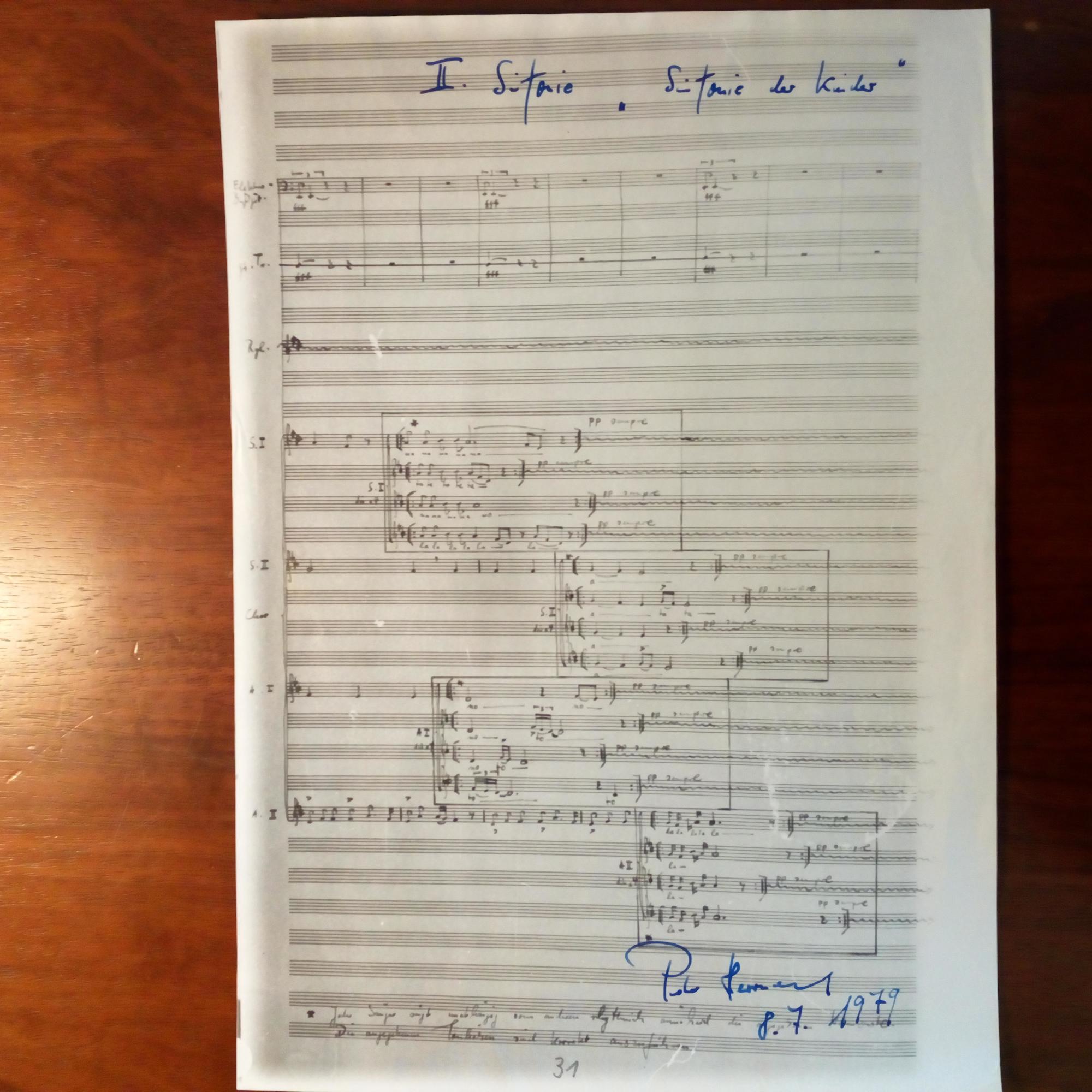 1941-2015, DDR-Komponist, Rektor der Leipziger Musikhochschule - Kopie eines Notenmanuskripts, 1 S. 4° ("S.31"), e. bezeichnet "II. Sinfonie, "Sinfonie der Kinder" mit U. und D. 8.7.1979.