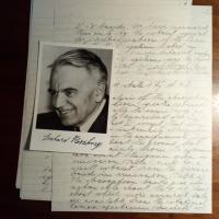 1904-99, kanad. Physiker dt. Herkunft - Sechs 4°-Seiten aus einem e. Manuskript, Bleistift. Dazu e. kl. Begleitbrief mit U., 20.2.1976. "Dies ist ein Teil des Entwurfes für eine Arbeit die demnächst in dem Canadian Journal of Physics erscheint...". Dazu Pfo. mit U. und Karte m.e. Grüßen und U. Beiliegt Pfo. mit E. und U. von 1987, etw. fleckig.