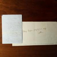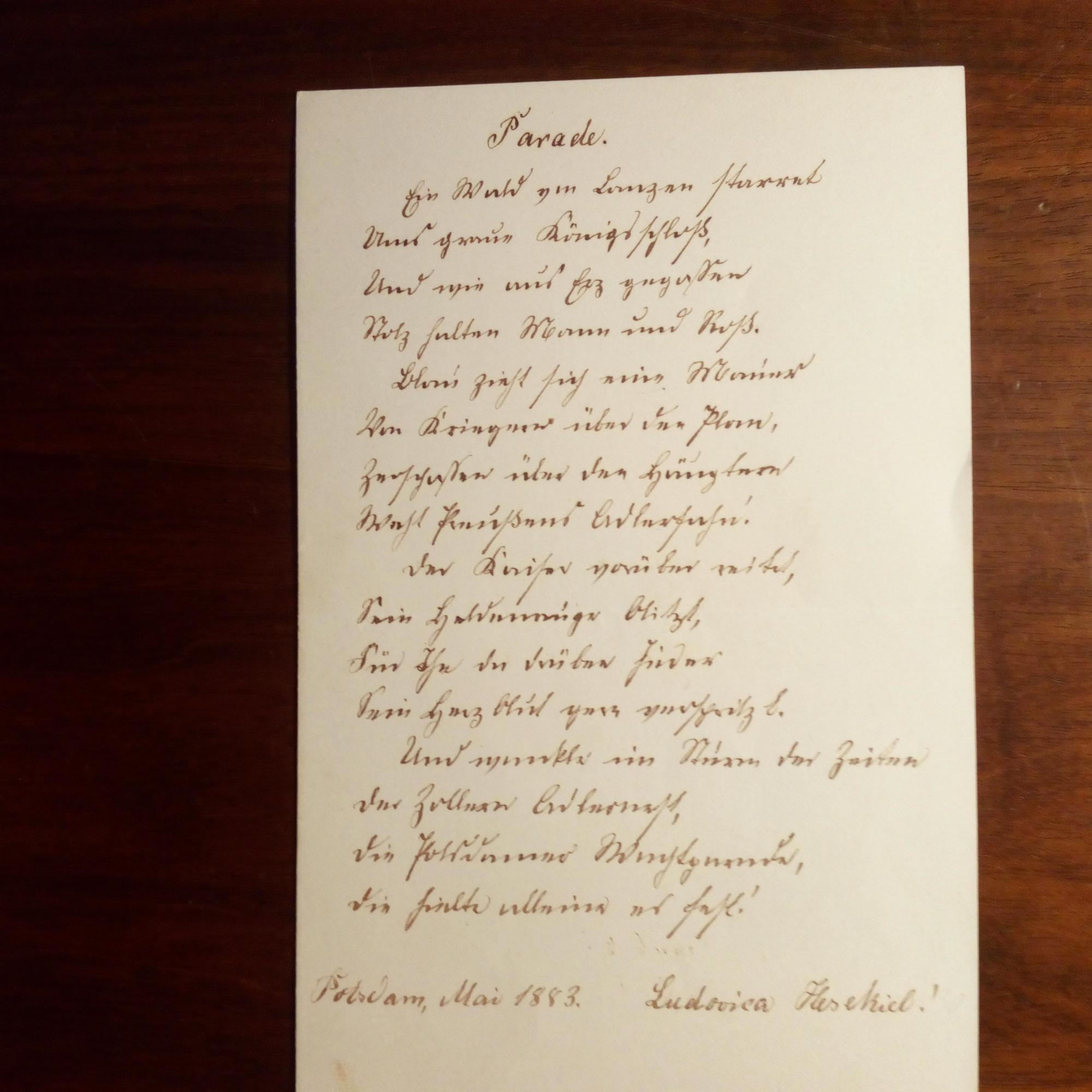 1847-89, Schriftstellerin, Patenkind von Tieck und Geibel - E. postal. Postkarte (11.1.1882) mit U. An Frau Geheimrat Herrlich: ...Würden Sie Fräulein Hirsch und mich hinauswerfen, wenn wir Sie morgen...besuchten... Beiliegen 2 Diktatbriefe mit U., Potsdam 14.5.1879 und 4.10.1881, zus. 1 ½ S. 8°, Aktenvermerke. An einen "hochverehrten Gönner": ...Anbei der Roman...für etwaige Striche oder Aenderungen lasse ich Ihnen völlig freie Hand... und bittet um Mitteilungen über Beziehungen der "Königin-Witwe" zum Johanniterorden, da sie z. Zt. an deren Biographie arbeite. Und: E. Gedicht (4 Str. à 4 Z.) mit U., Potsdam Mai 1883, 1 S. kl. 8°, e. Schönschrift. "Parade. Ein Wald von Lanzen starret/ Ans graue Königsschloß,/ Und wie aus Erz gegoßen/ Stolz halten Mann und Roß...".