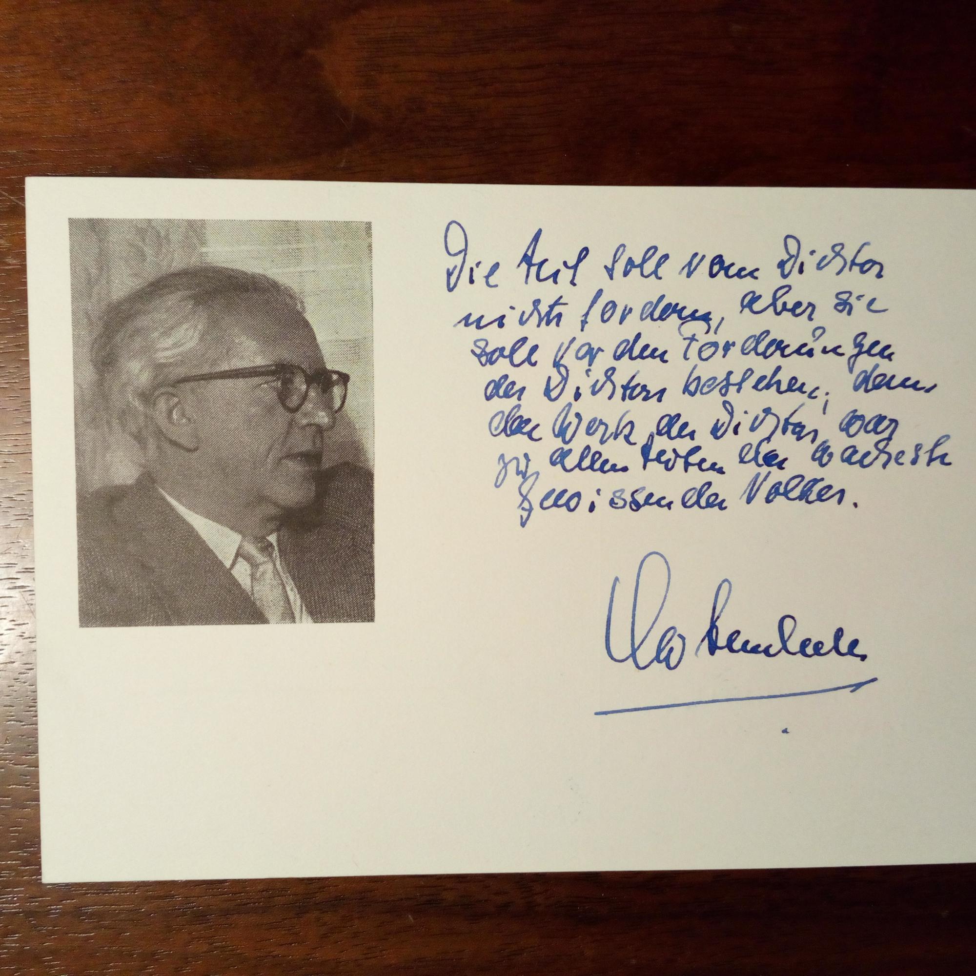 1900-96, Schriftsteller - 3 e. Briefe, Berlin und Waiblingen 1920, zus. 10 S. 8°, dicht geschr., und e. Briefkarte (2 S.) mit U. An Freund "Hans" betr. Vorfällen um ein Mädchen in Tübingen, die Wunden geschlagen hätten (dazu auch ein Hölderlin-Zitat), und ausführl. von seinem neuen Leben in Berlin: Theaterbesuche, Ausflüge ins Umland, die Universität: ...Jetzt ist aus mir mein alter Seelenwunsch aufgestiegen. So möchte ich leben, ewig in diesem seligen Leben... Beiliegen: E. Gedicht ("Erinnerung", 19 Z.) mit U., 3 Karten mit e. Zitat und U., eine mit postal. Umschlag, 3 kl. Verl.prospekte, mit U. bzw. mit e. Grüßen und U., und gedr. Dankkarte für Wünsche zum 70. Geb. mit U. (zus. 11 Autographen).