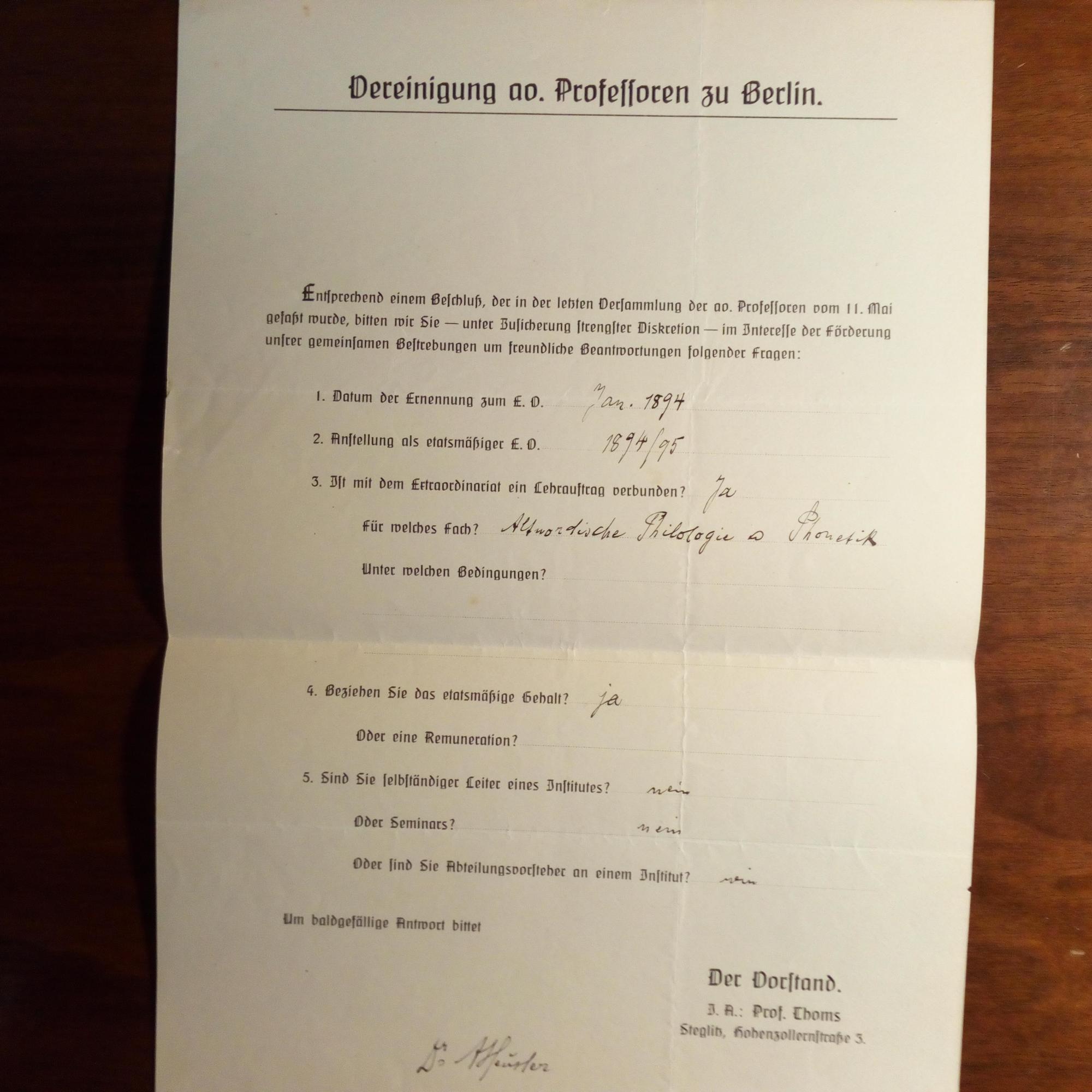 1865-1940, schweiz. Germanist - E. ausgef. Formular (1 S. folio) der "Vereinigung ao. Professoren zu Berlin" m. U. (Lehrauftrag vom Jan. 1894 für "Altnordische Philologie u. Phonetik").