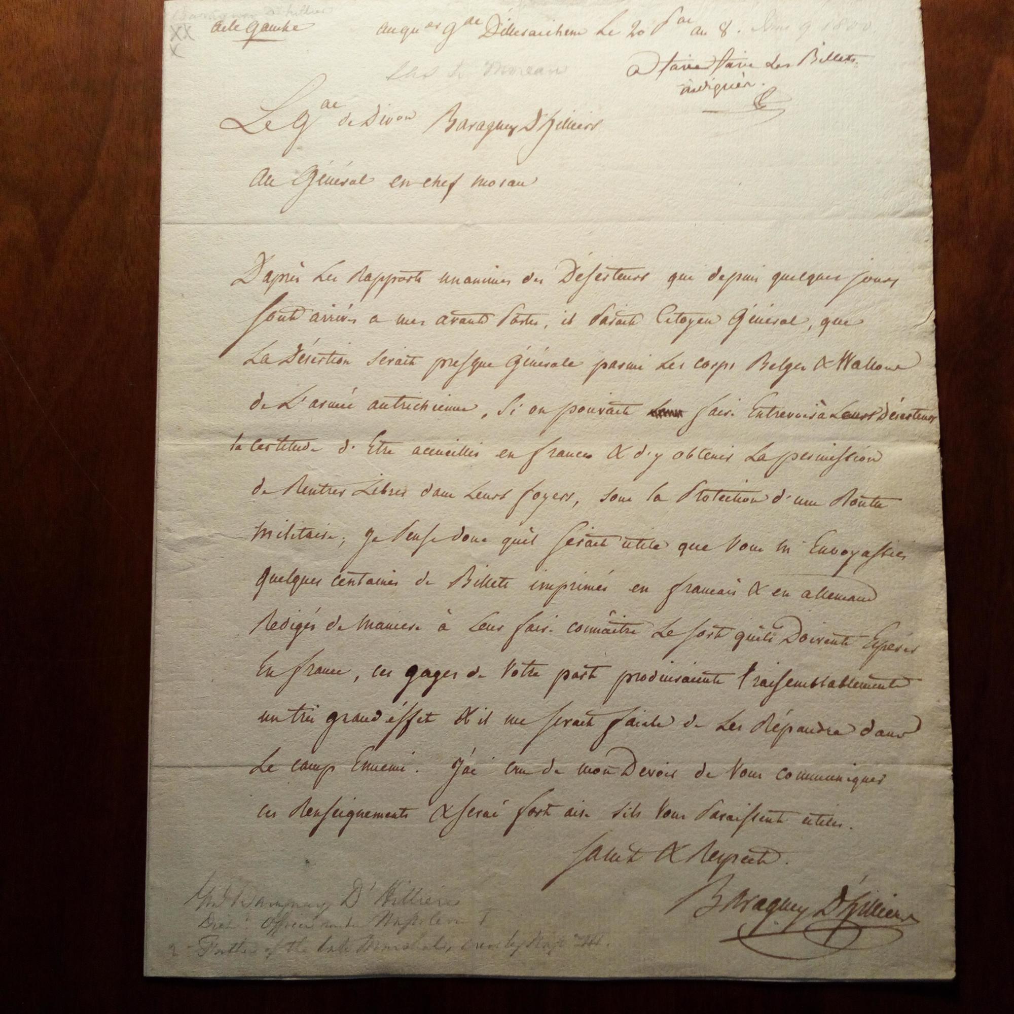 1764-1812, frz. General - E. Brief mit U., "au qu.er g.le D'illeraichen (Bayern) Le 20 prairial an 8" (9.6.1800), 1 S. 4°, Adresse, Siegel. An den "Général en chef" Jean-Victor Moreau (1763-1813) in Memmingen: Anlässl. der Nachricht von der Ankunft von Deserteuren: "...La Désertion serait presque générale parmi les corps Belge & Wallone de l'armée autriche: ..Si on pouvait faire Entrevoir à Leurs Déserteurs la certitude d'Etre acuillés en france & y obtenir la permission de rentrer Libres dans Leurs foyers, sous la Protection d'une Route militaire; Je pense donc qu'il sérait utile que vous m'Envoyastiez quelques centaines de Billets inprimées en francais & en allemand Redigés de maniere... Angeheftet sind 2 Faksimile-Briefe. Beiliegt Porträt (nach Stich).