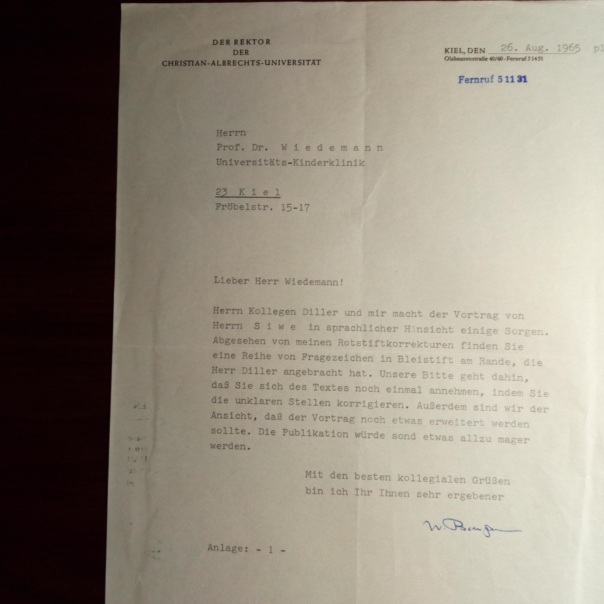 1906-78, Anatom - Br. m. U., (Kiel) 16.10.1972, 1 S. 8° quer, Br.kopf des Instituts. An den Pädiater Hans-Rudolf Wiedemann (1919-2008) in Kiel. U.a. ...die ärgerliche Nymphe habe ich inzwischen ausfindig gemacht und ich wollte Ihnen darüber bei der nächsten Fakultätssitzung berichten... Beiliegt ähnlicher, in dem er "zum Frühschoppen in den Kursraum des Pharmakologischen Institutes" lädt. M. e. Umschlag.