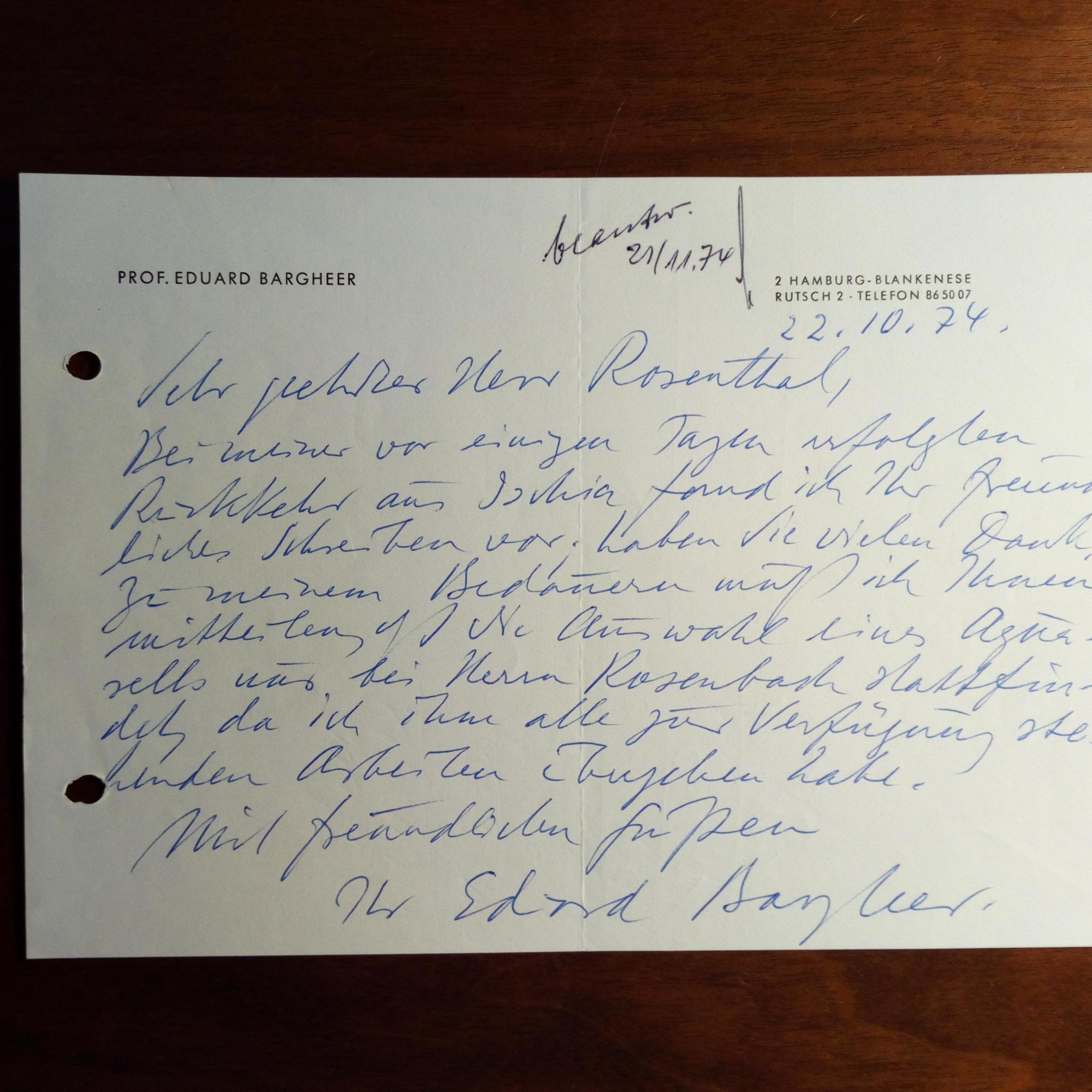 1901-79, Maler - E. Br. m. U., (Hamburg) 22.10.1974, 1 S. 8° quer, Br.kopf, gel., Bearb.vermerk. An Rosenthal: ...daß die Auswahl eines Aquarells nur bei Herrn Rosenbusch stattfindet da ich ihm alle zur Verfügung stehenden Arbeiten übergeben habe... Beiliegen: ein e. Umschlag, Kunstdruck (nach seiner Litho "Südliche Stadt" 1972) mit Bleistift-U., ca. 8°quer. Eingelegt ist ein Neujahrsgruß-Faltblatt von Rosenbach mit Hinweis auf das von ihm hrsg. Werksverzeichnis von B.)