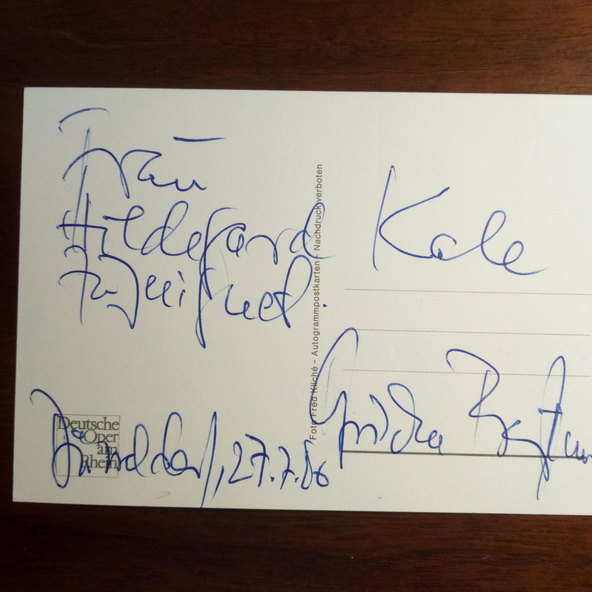 1914-2012, ungar.-dt. Sopranistin - Pfo. (ca. 8°, in Prinzessinnen-Kostüm mit Windhunden) mit E., U. und Jahr 1979. Beiliegen: Pfo. (Electrola-Schallplattenwerbung, um 1970) mit U., und ähnlich mit späterer Widm., U. und Jahr 1988.