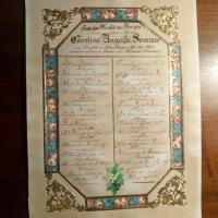Prachtvolles handgefertigtes Blatt (mit montierten gedr. Blumenbändern und goldenem Luxuspapier) mit Widm. (Geb.gruß ihrer Töchter für Frau C. A. Sommer, 26.5.1871), 1 S. folio, mit handschriftl. Gedicht (6 Str. à 4 Z.), leichte Lichtverfärbungen. Typische Heimarbeit des Historismus.