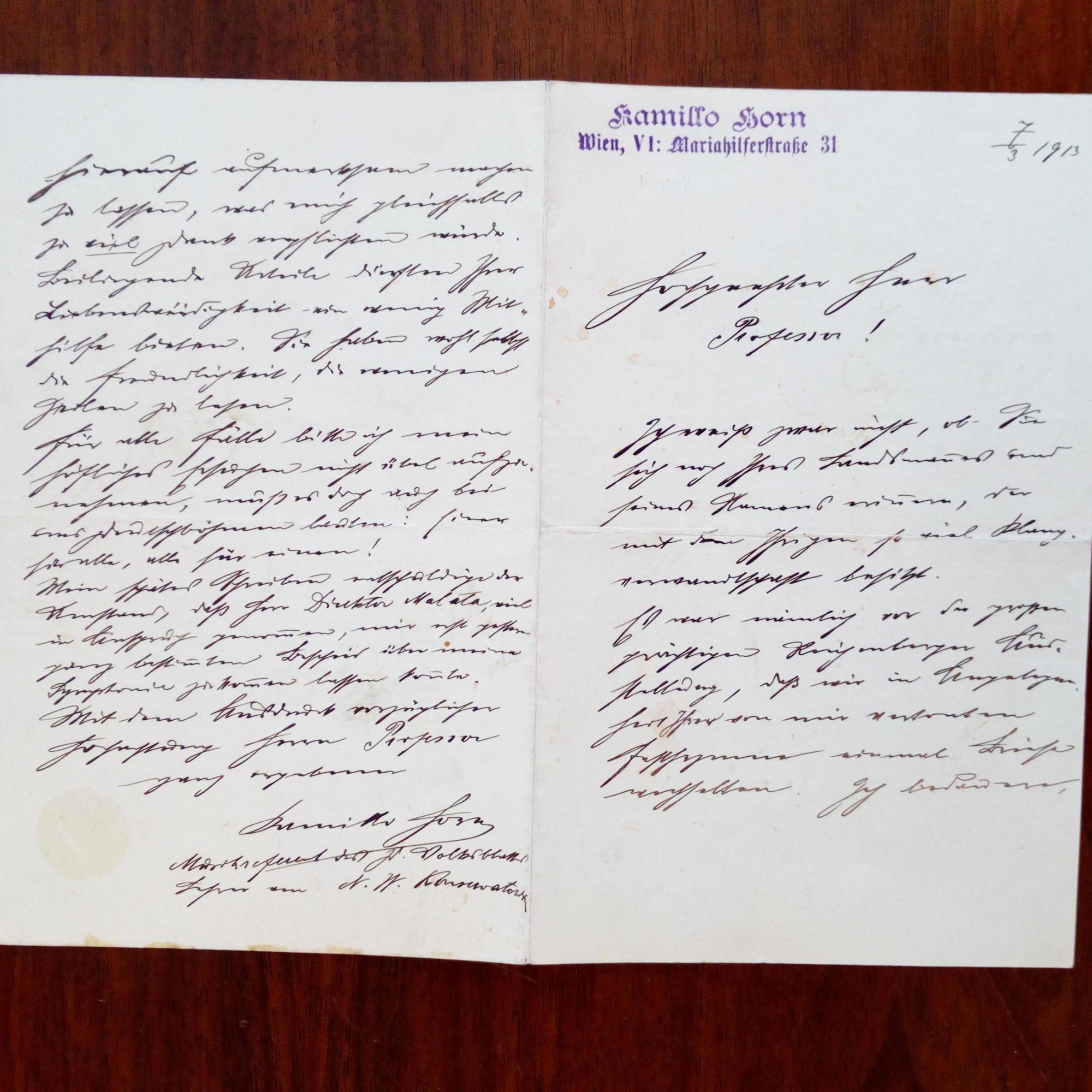 1860-1941, böhm. Komponist (Schüler von Bruckner) und Kritiker - E. Brief mit U., (Wien) 7.3.1913, 4 S. kl. 8°, kl. Schrift. Macht einen Freund in Chemnitz auf die dort stattfindende Aufführung seiner Symphonie aufmerksam (durch MD Oskar Malata) und über Erfolge davon in anderen Städten. Bittet um Besuch des Konzerts: ...muß es doch auch bei uns Deutschböhmen lauten: Einer für alle, alle für einen!...