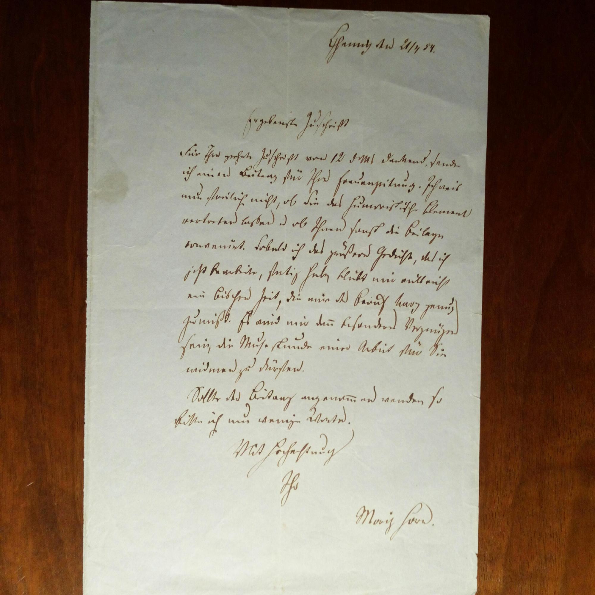 1814-74, Schriftsteller - E. Brief mit U., Chemnitz 21.4.1854, 1 S. 8°, kl. Gebr.spuren. "Ergebenste Zuschrift" (die Feministin Louise Otto-Peters, 1819-95): Sendet einen Beitrag für die "Frauenzeitung": Wenn die Arbeit an einem "großen Gedicht" beendet sei, werde es"ein besonderes Vergnügen sein, die Musestunde einer Arbeit für Sie widmen zu dürfen...".