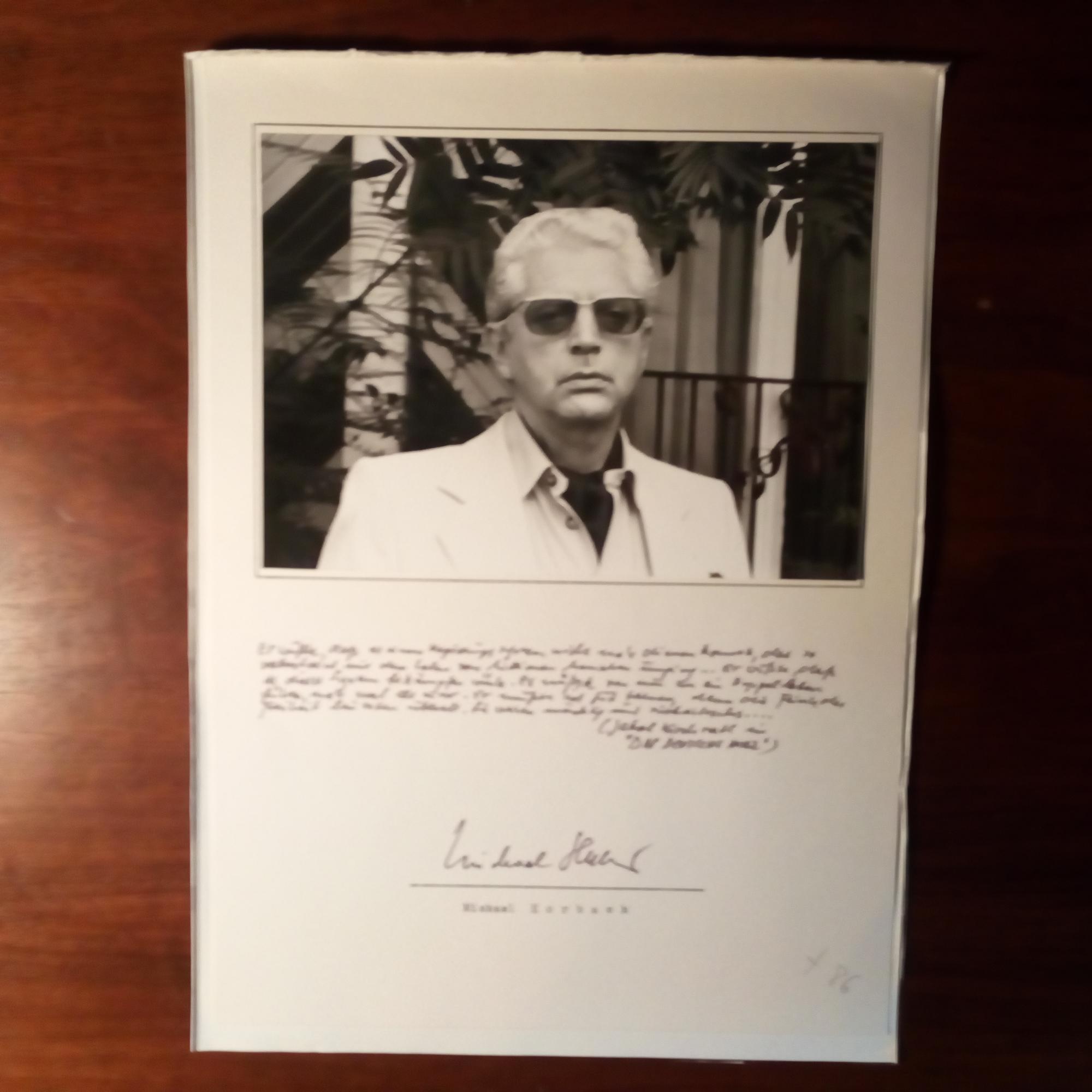 1924-86, Schriftsteller - E. Zitat (6 Z., dicht geschr., aus "Das deutsche Herz") und U. unter auf 4° mont. privatem Pfo. (Hochglanz). Mit ausführl. Begleitbrief mit U., (Châteauneuf-du-Pape) 23.1.1979, mit Briefkopf. Beiliegt ein Widm.exemplar des Romans "Sag mir auf Wiedersehen", seiner von ihm getöteten Gattin (erweiterter Suizid), der Schriftstellerin Alexandra Cordes (geb. 1935).