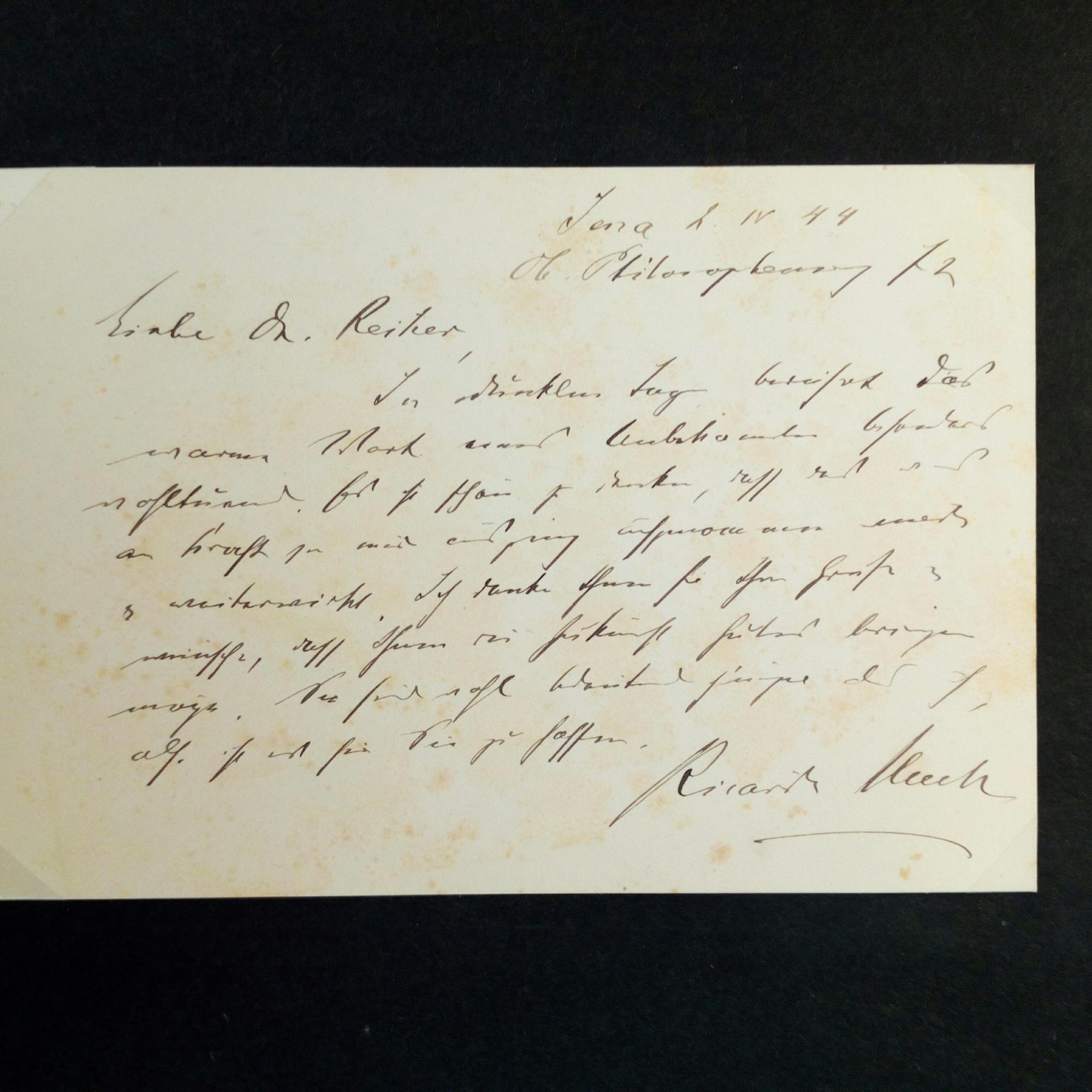 1864-1947, Schriftst. - E. Br.karte m. U., Jena 2.4.1944, 1 S., ger. stockfleckig. An "Dr. Reiher": ...In dunklen Tagen berührt das warme Wort eines Unbekannten besonders wohltuend ... Ihnen die Zukunft gutes bringen möge. Sie sind wohl bedeutend jünger als ich, also ist es für Sie zu hoffen...