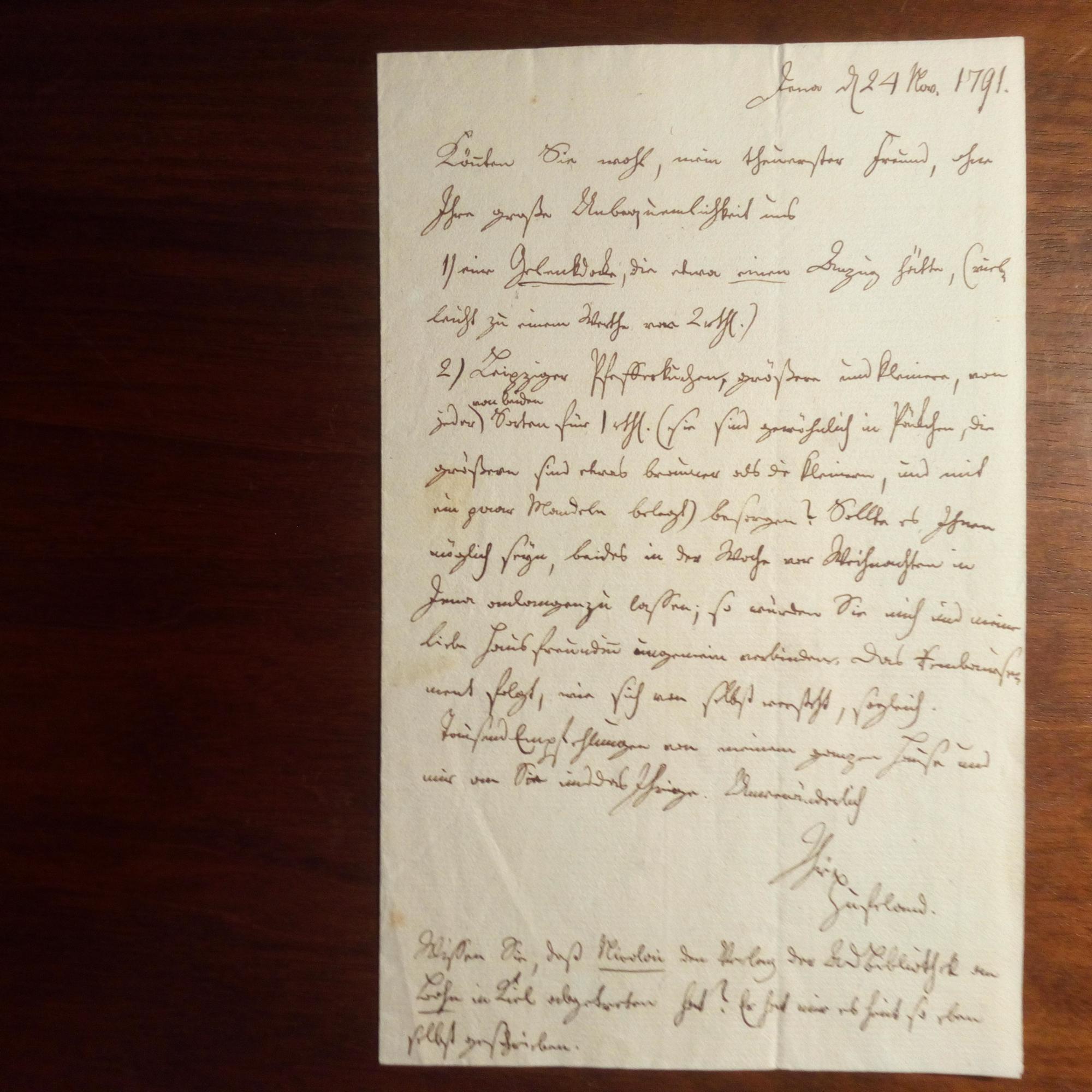 1760-1817, Jurist u. Publizist- 3 e. Briefe, je mit U., Jena, je 1 S. 8°. Transkriptionen liegen bei. An Verleger Georg Joachim Göschen (1752-1828) in Leipzig: 4.11.1791: Bräuchte für Weihnachten einen Anzug und "Leipziger Pfefferkuchen". ...Wissen Sie, daß Nicolai (Friedrich, Schriftsteller und Verleger) den Verlag der ADB (Allg. Dt. Bibliothek) an Bohn (Carl) in Kiel abgegeben hat?.../ 5.3.1797: Betr. seiner "Schlußrechnung" und lädt ihn mit Gattin ein./ 4.8.1798: Dankt "für den Boullé" ("Mémoires sur la révolution française", London 1797). ...Die Recension von Racknitz (Joseph Friedrich von, kursächs. Hofmarschall) ist schon für die Druckerey durchgesehen und wandert morgen hin...Wiedemann mag Ihnen...einen recht großen Kratzfuß machen. - Hat er jetzt die Uebersetzung für die Vossische Buchh.?...